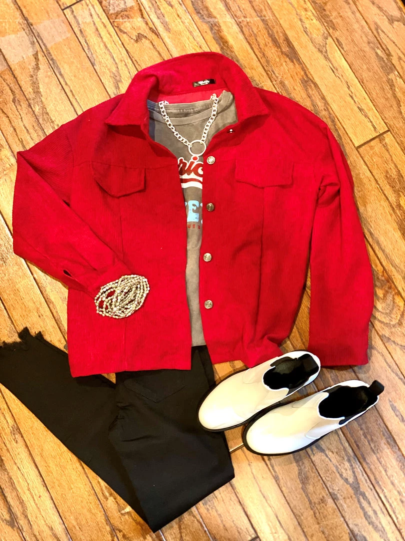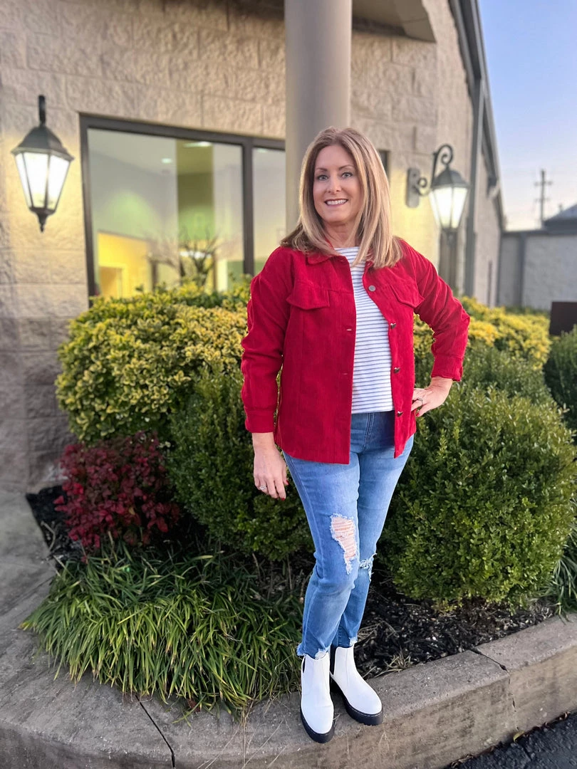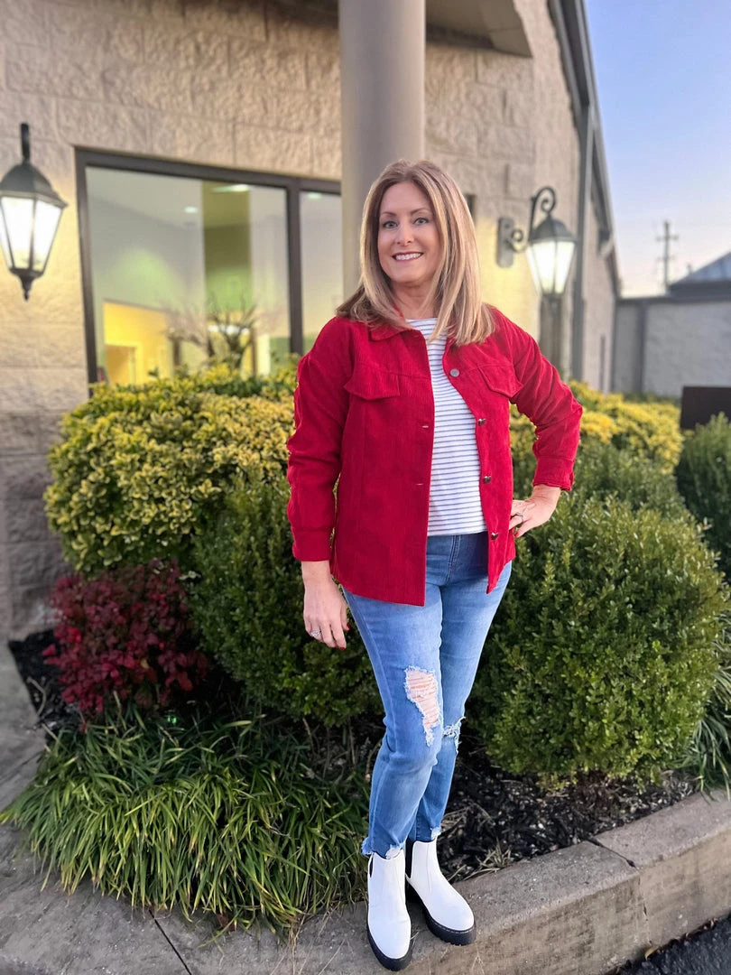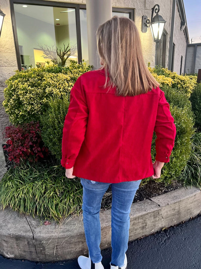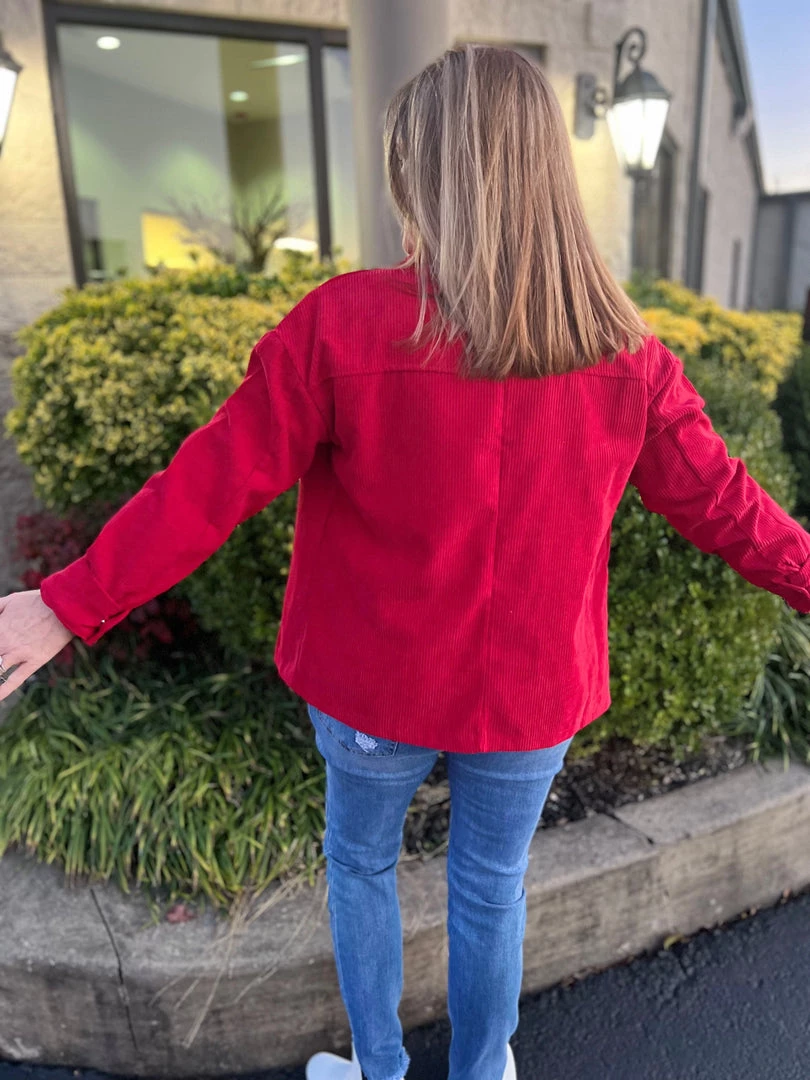 Button up thin pile corduroy top in a rich red color. Faux chest pockets and a cut that is very flattering. This one could be worn as a shirt or top a tee with it for a jacket look. Length is shorter than a true shacket. 100% Polyester