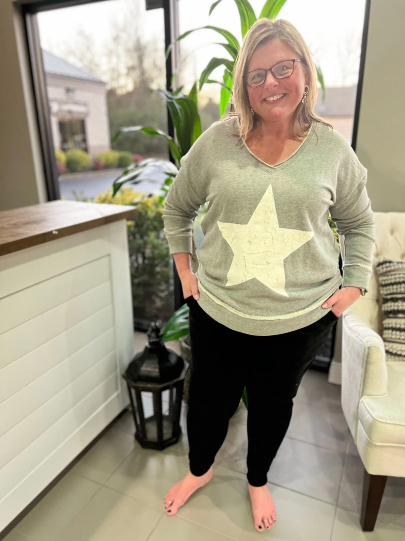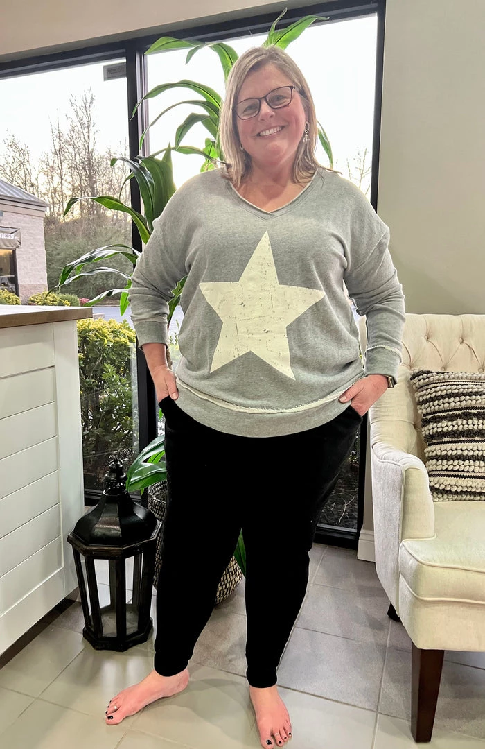 This V-neck sweatshirt is a must for every true superstar. It features long sleeves with raw seam accents around the wrists, collar, and bottom hem. The printed large white star in the center front has a distressed or vintage look for a chic, effortless vibe. 100% cotton terry.