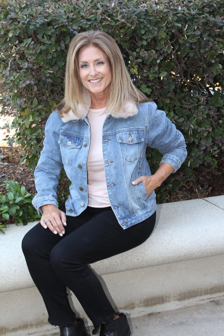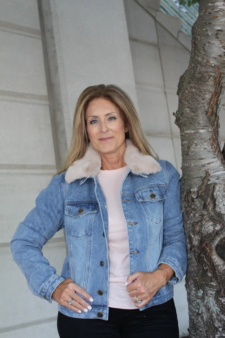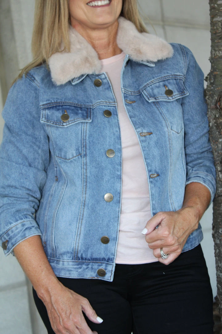 This biker-chic denim jacket is adorable! It has a vintage faded look with long sleeves, and detachable faux-fur collar. Wear it with or without the faux-fur collar for totally different looks.  100% Cotton