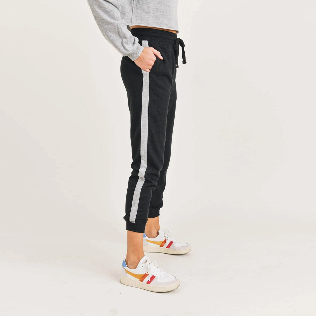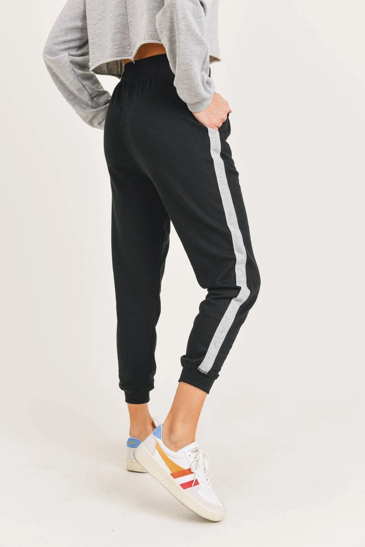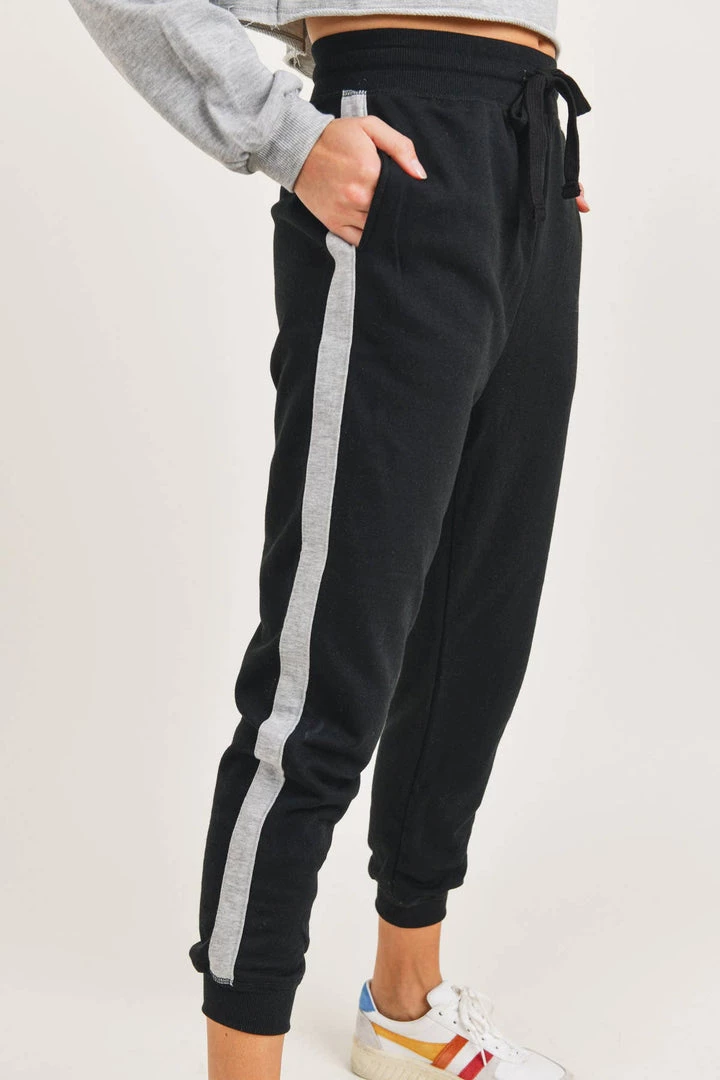 These joggers feature a slim, color block panel on the side for a flattering silhouette and length, a waistband with a drawstring, and cuffed ankles. 65% polyester, 35% cotton