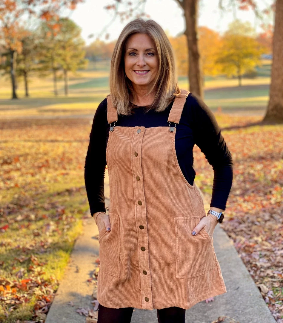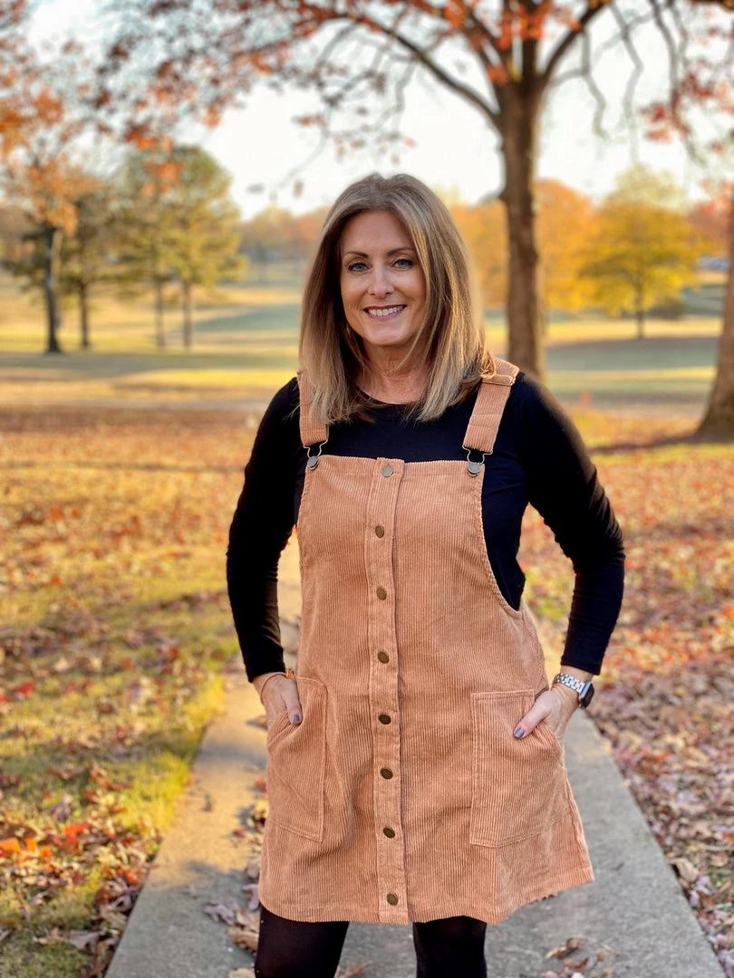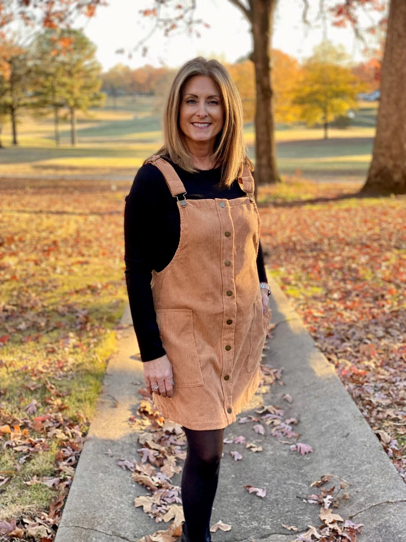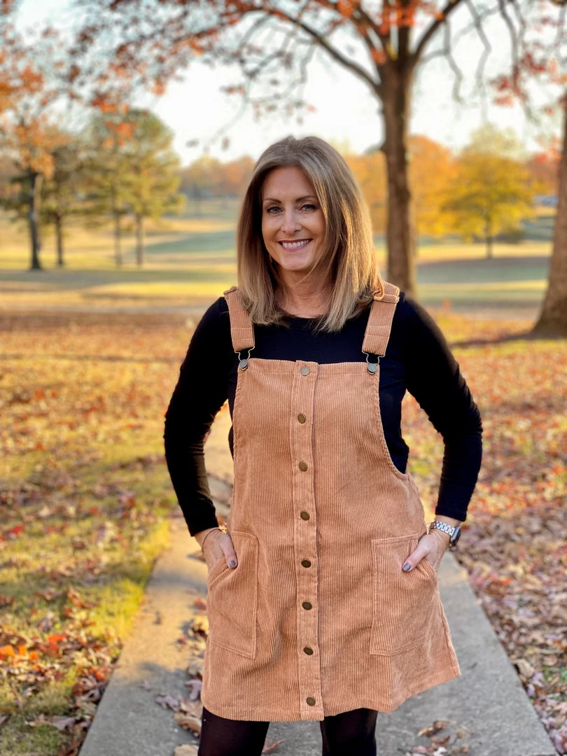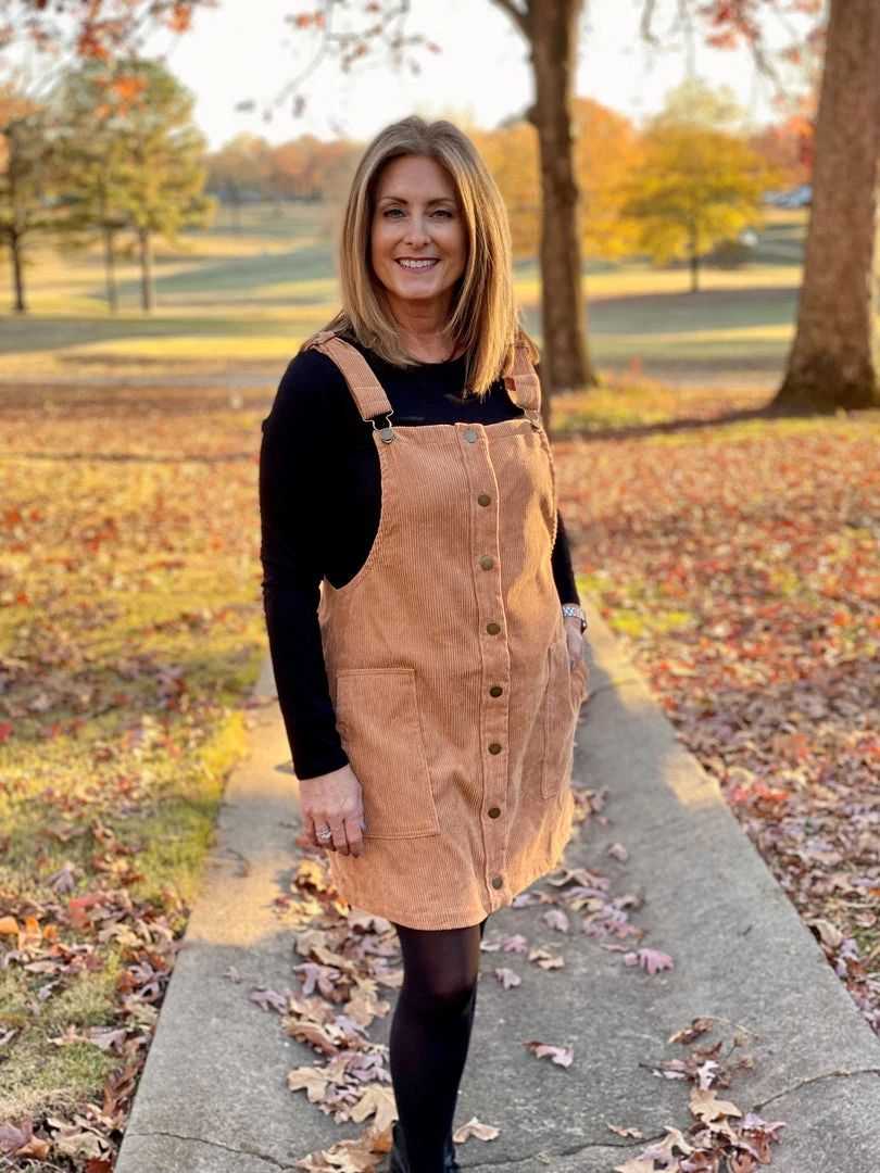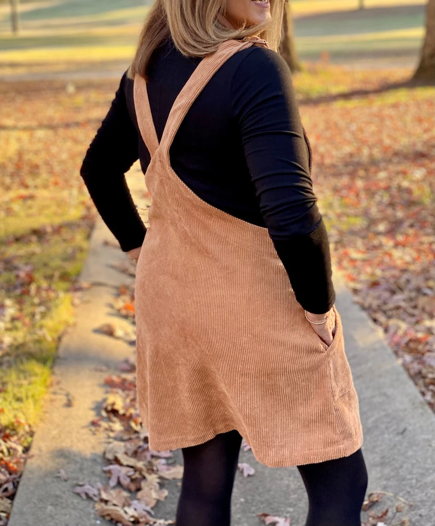 What a cute corduroy overall mini-dress! This dress buttons up the front, has adjustable straps, and is so soft. You can dress this one up or down. Pair it with some knee high boots for a go anywhere look.
