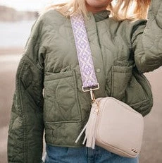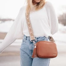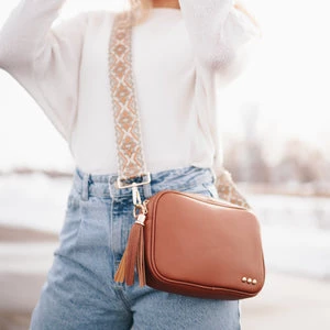 This Faux-leather crossbody bag is so soft and dreamy. Comes with a trendy and fun canvas strap and shiny gold classic hardware! Zippered Top and linen beige interior with a zippered stash pocket on the inside. Adjustable shoulder strap up to 46 inches. Bag measures 9.5″ x 6″ x 2″