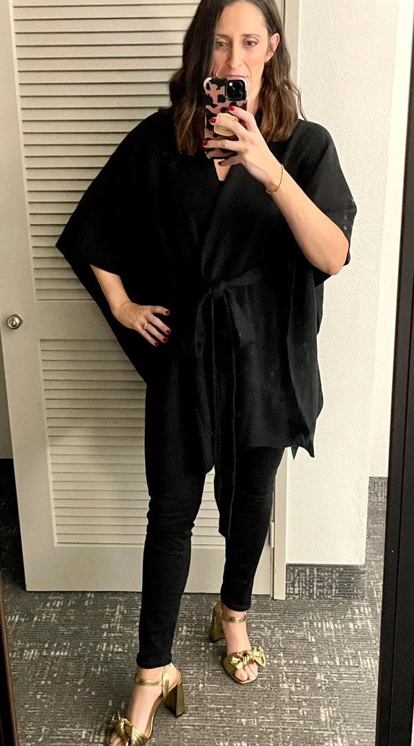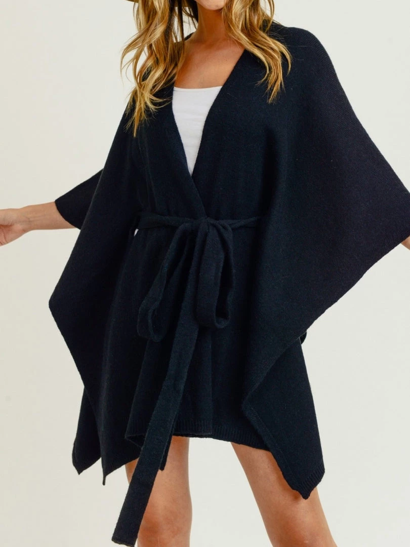 Black belted waistline poncho style cardigan with wide half sleeves is a classic piece that will go with everything. You can wear this one almost year around and dress it up or wear it casual. Medium weight fabric and non-sheer.