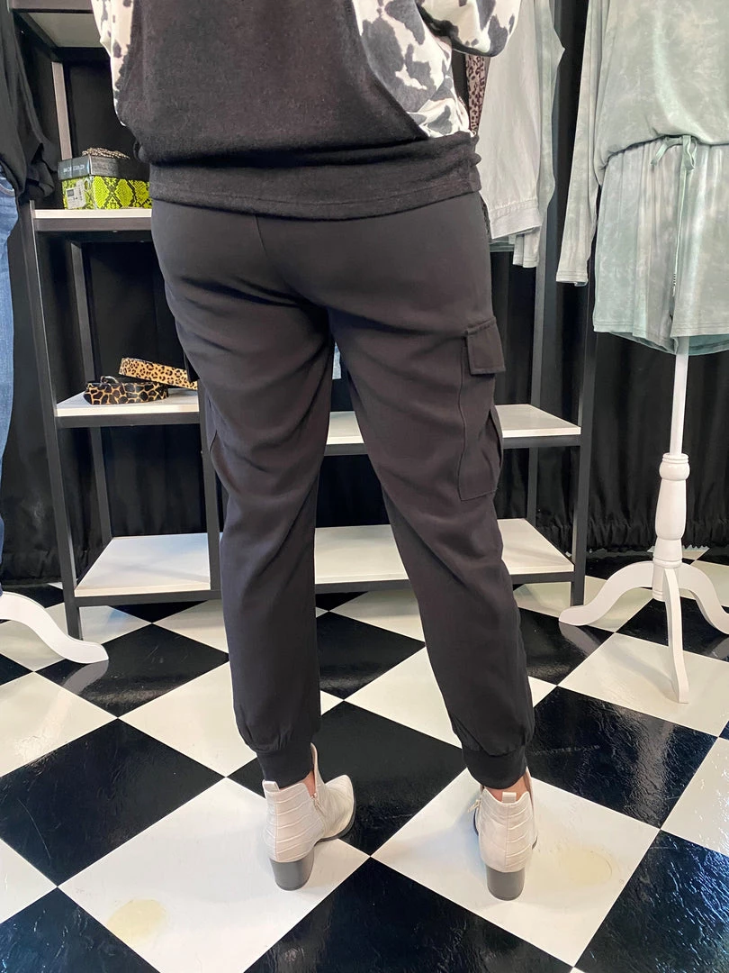 These black cargo pants feature a partially elastic back waist with a zip fly and button. Slanted side pockets as well as cargo pockets.