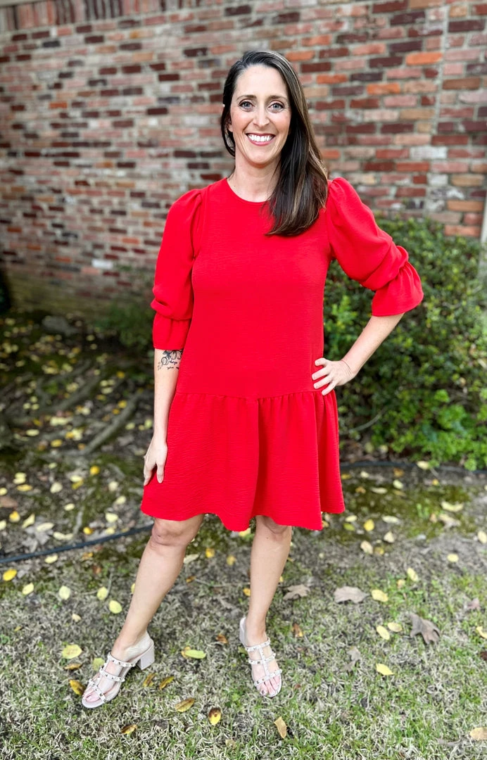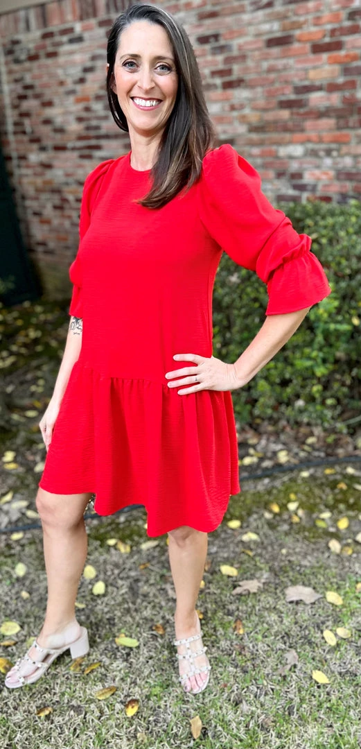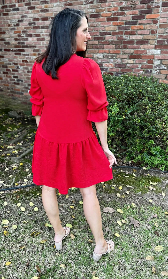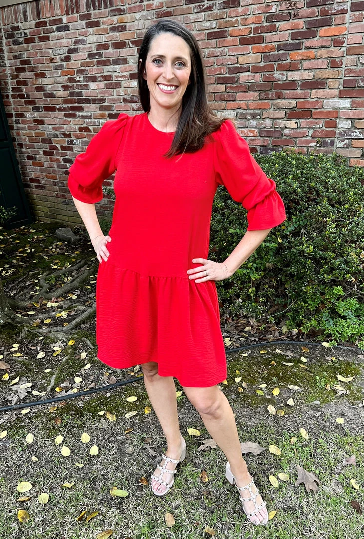 We love the sleeve detail on this drop waist red dress! Round neck with back button keyhole closure. Elastic in the sleeve with ruffle detail. Shirring along the shoulder. Solid woven air flow fabric that is great for those warmer days! 100% Polyester, Brand is 2Hearts
