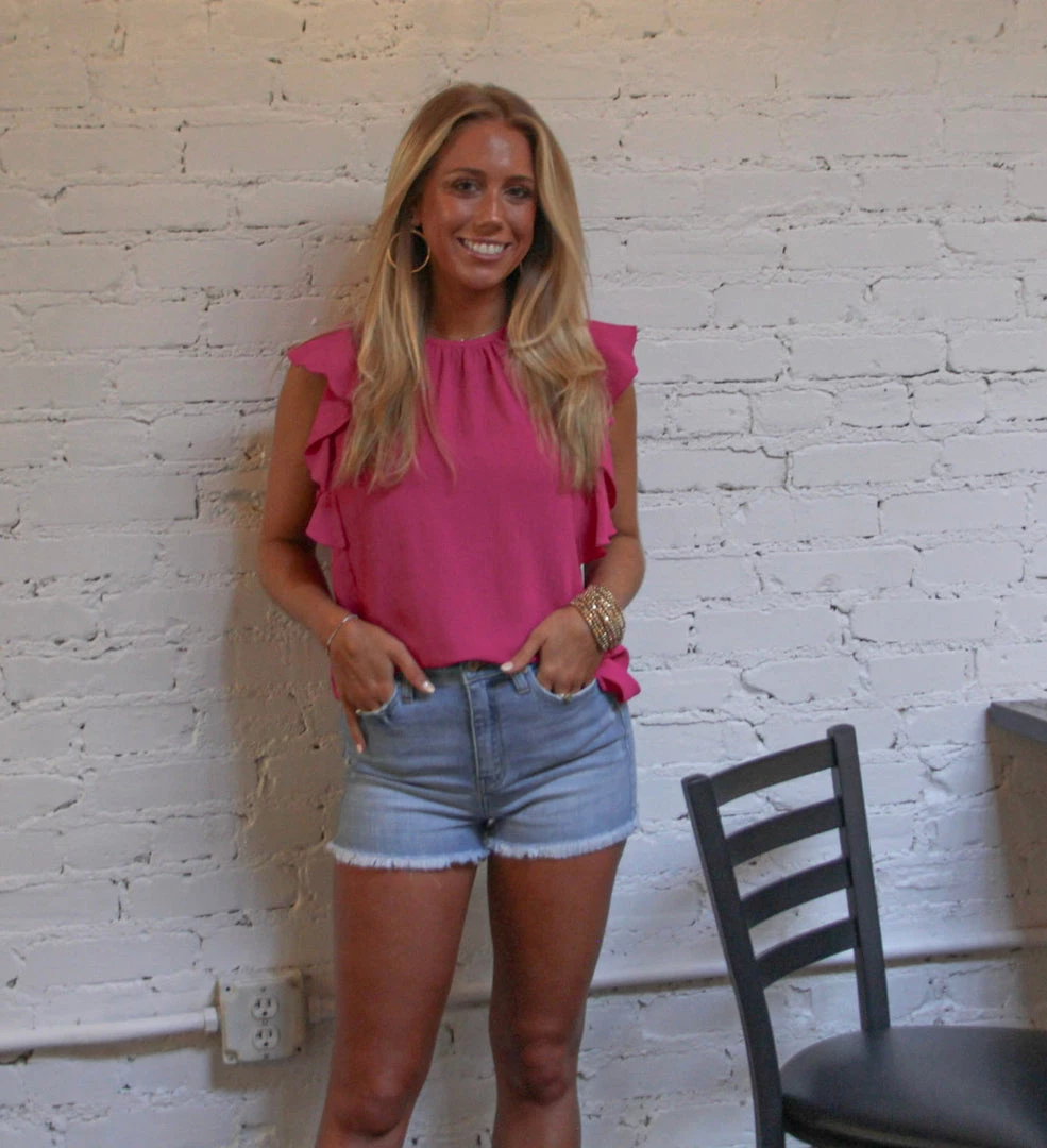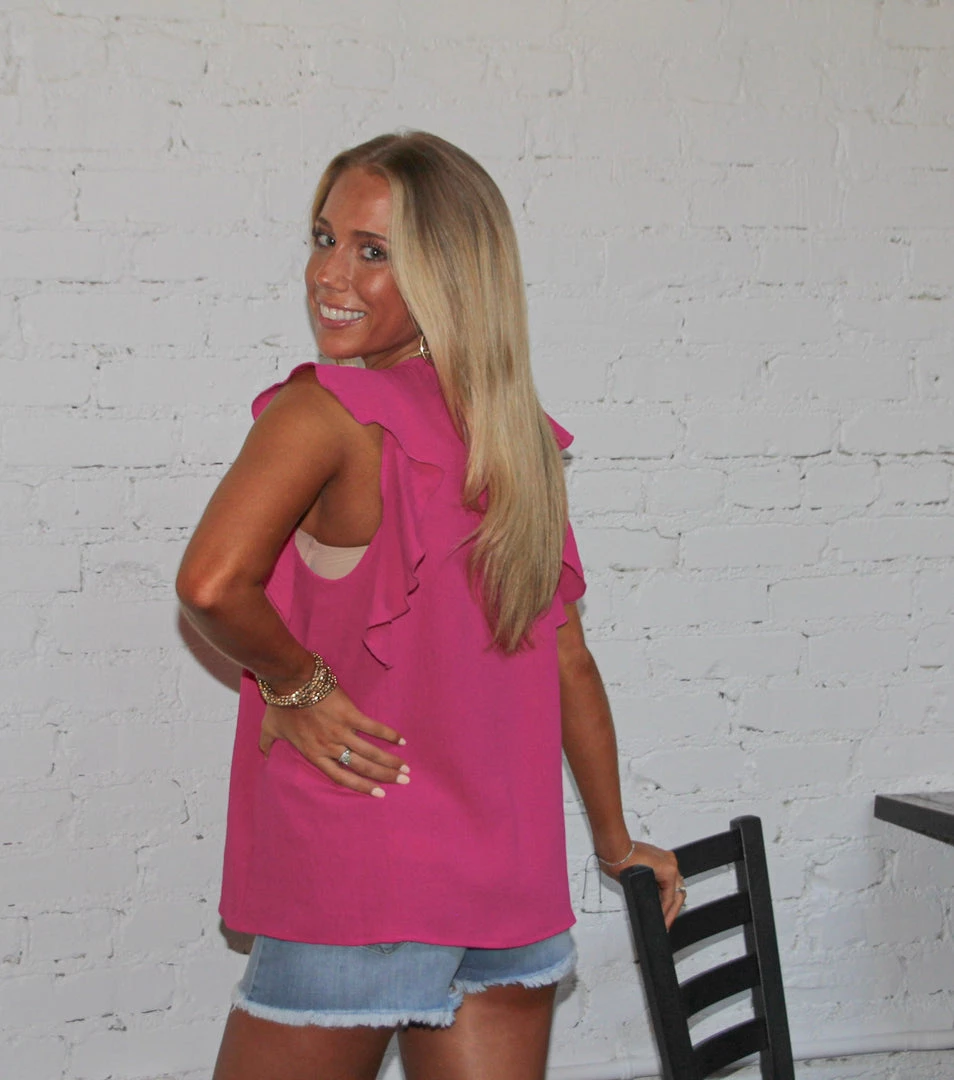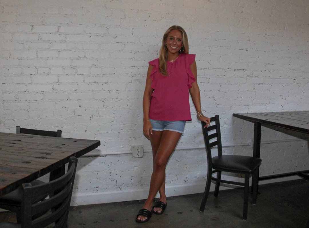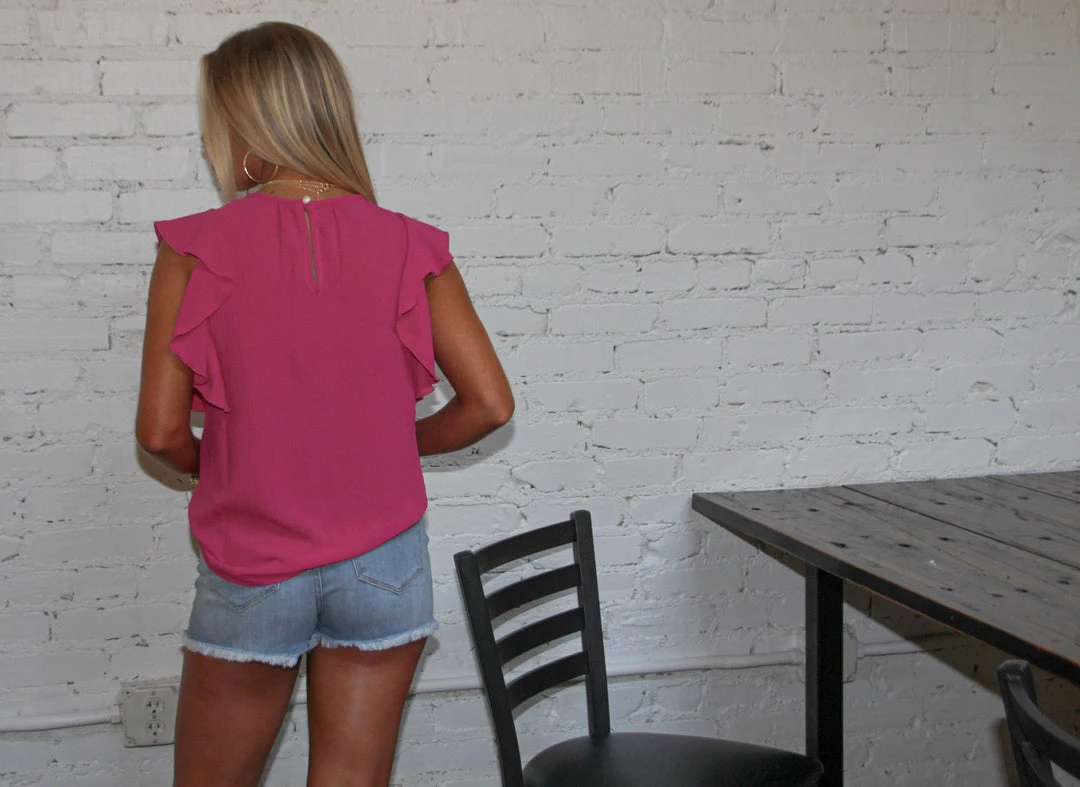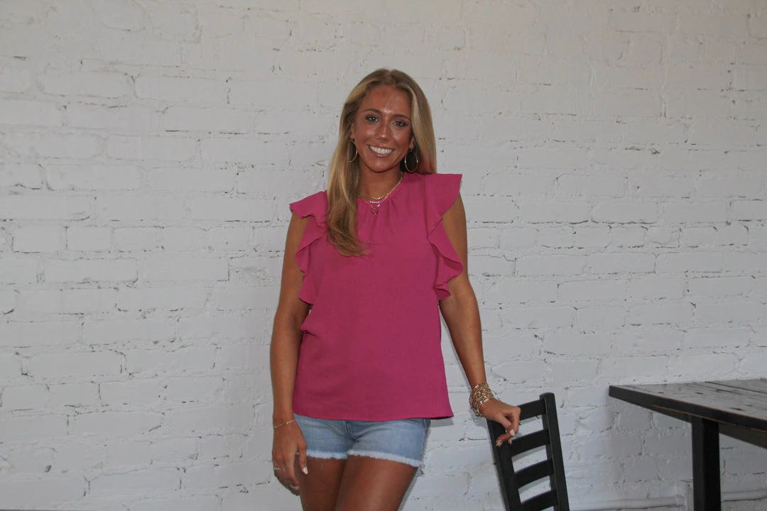 This color is amazing! The magenta flutter sleeve has cascading detail down the panel side. Shirring detail along front and back neckline with a button keyhole closure. Solid woven air flow fabric.