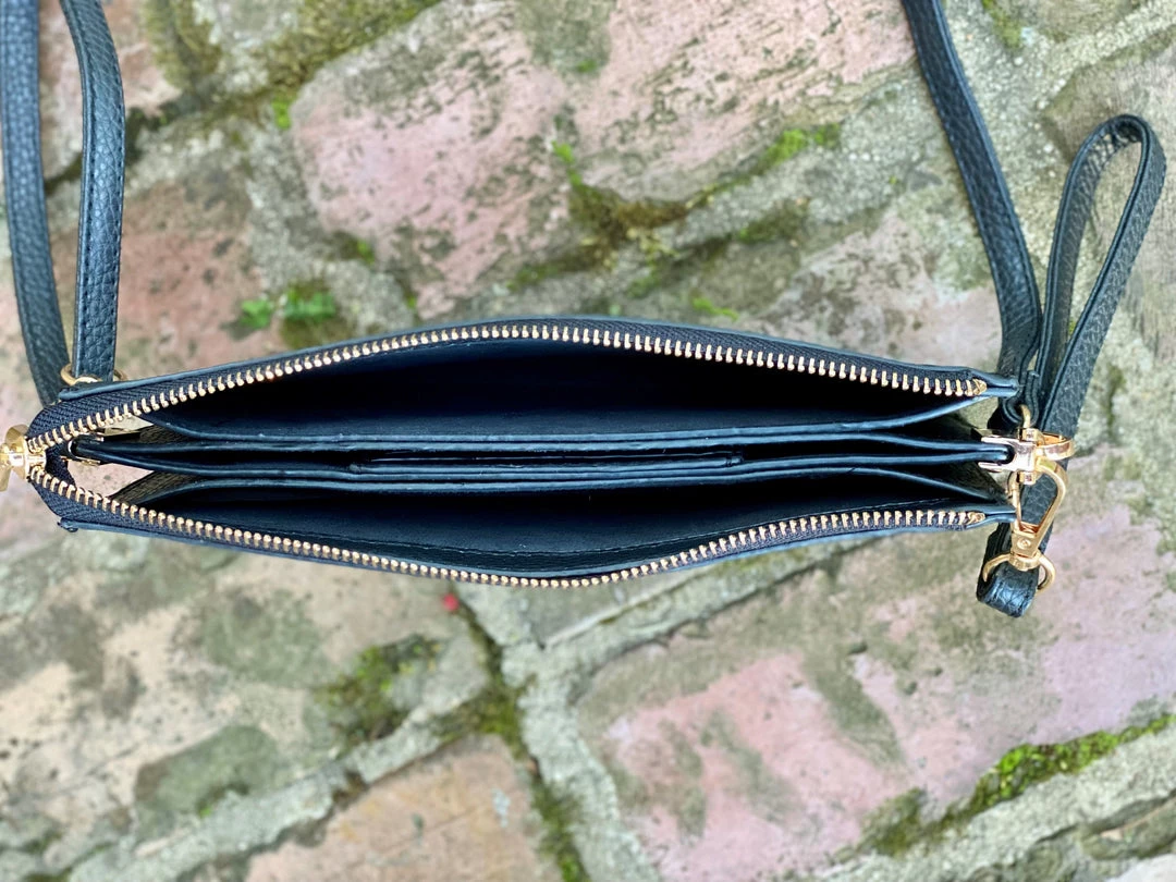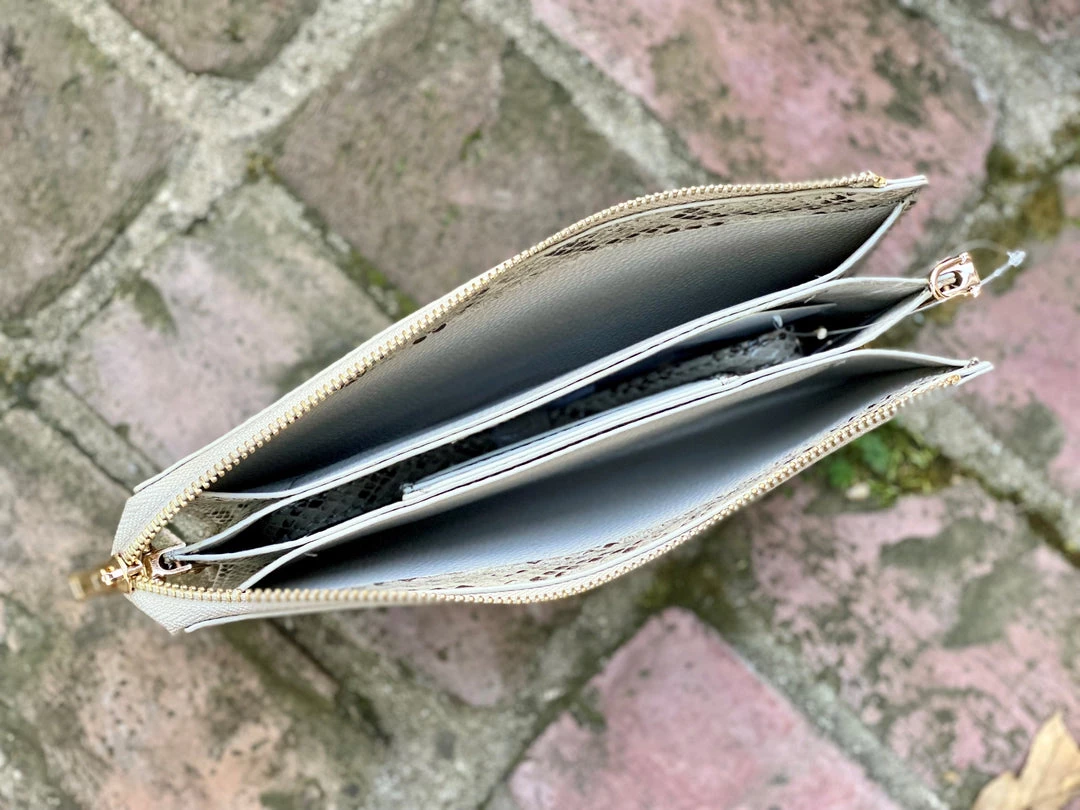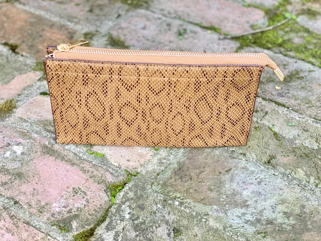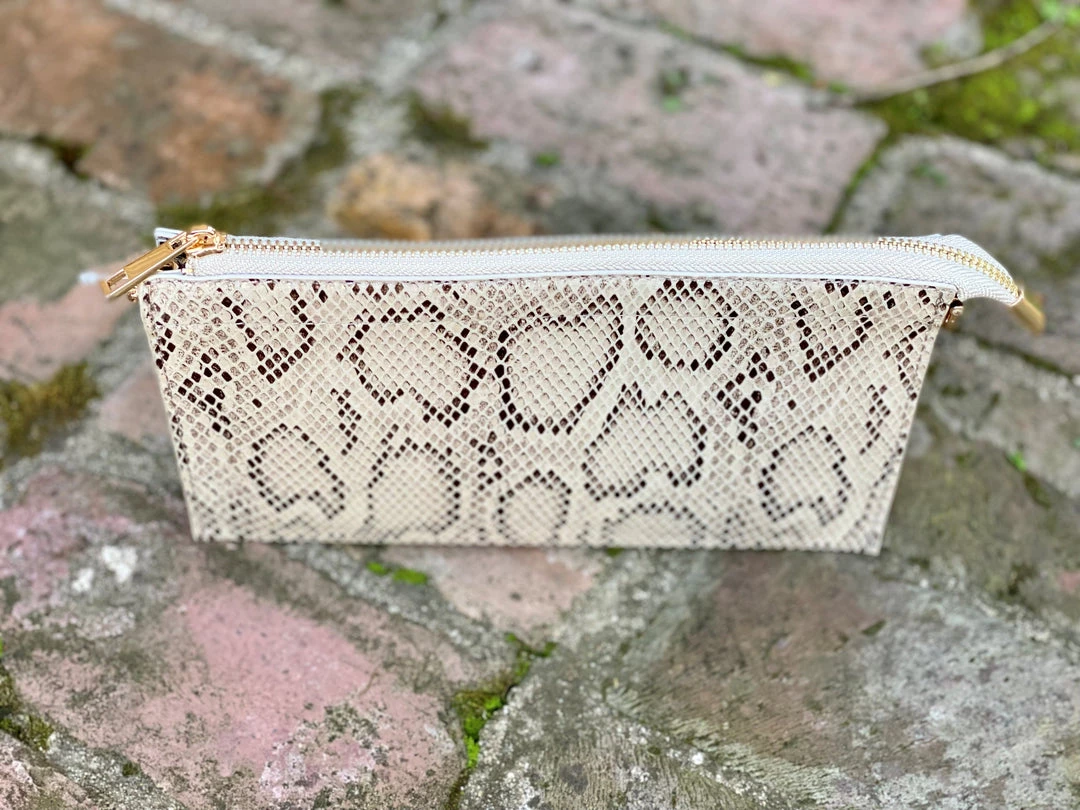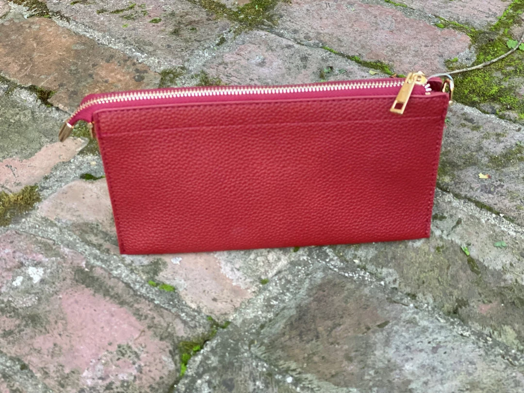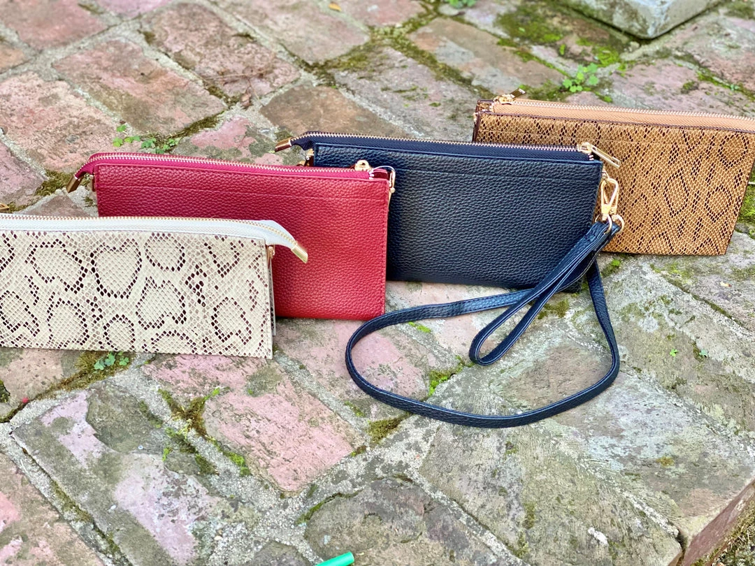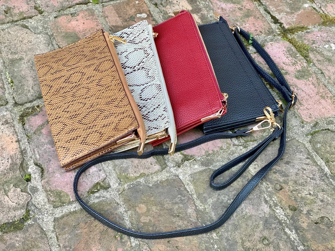 This cross body style come with a wrist and a long strap. Use as a cross body when you are ready to shop or play. Comes in red, black, white snake skin, and brown snake skin.