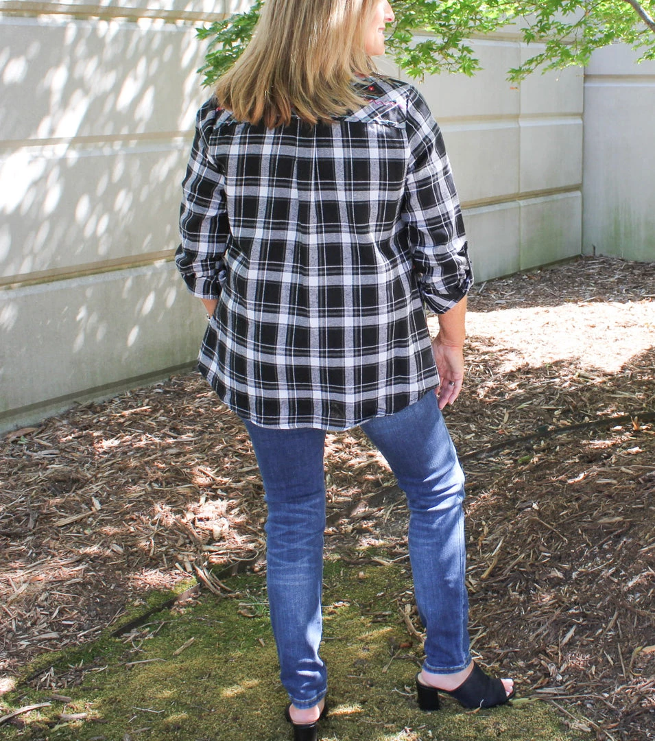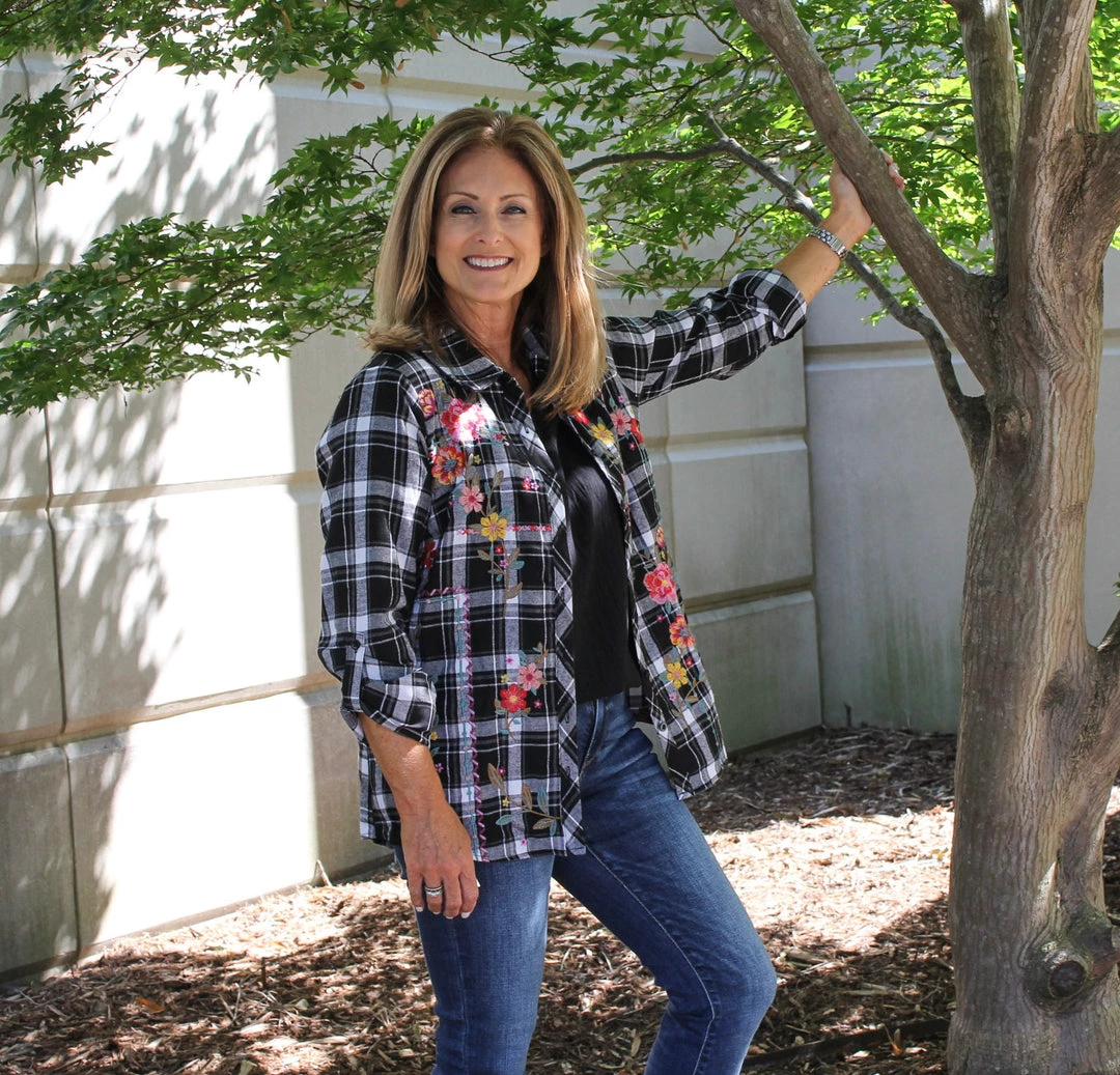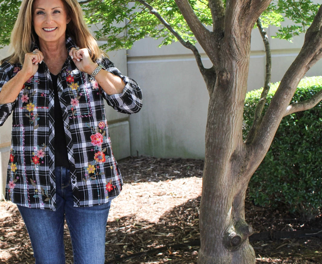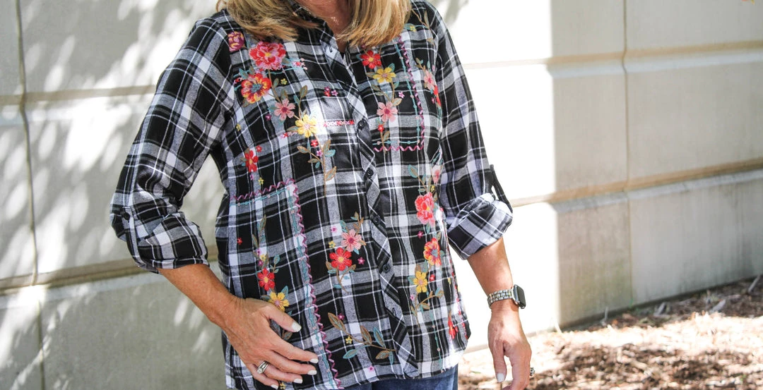 This delicately embroidered flannel top is precious! It combines the warmth and comfort of flannel with a little extra feminine touch for a amazing look. You need this one!