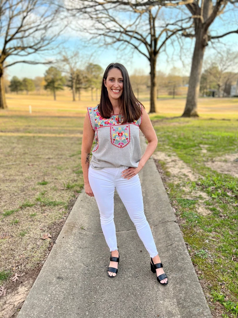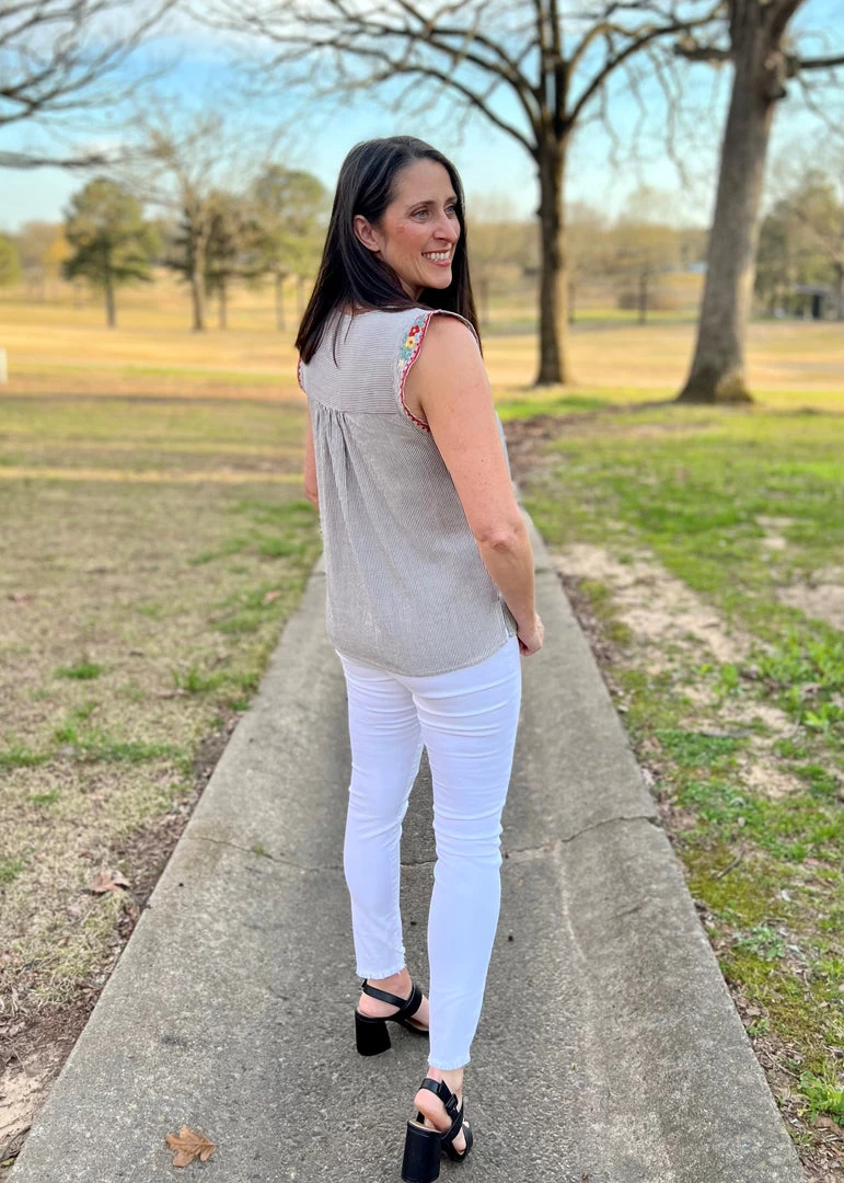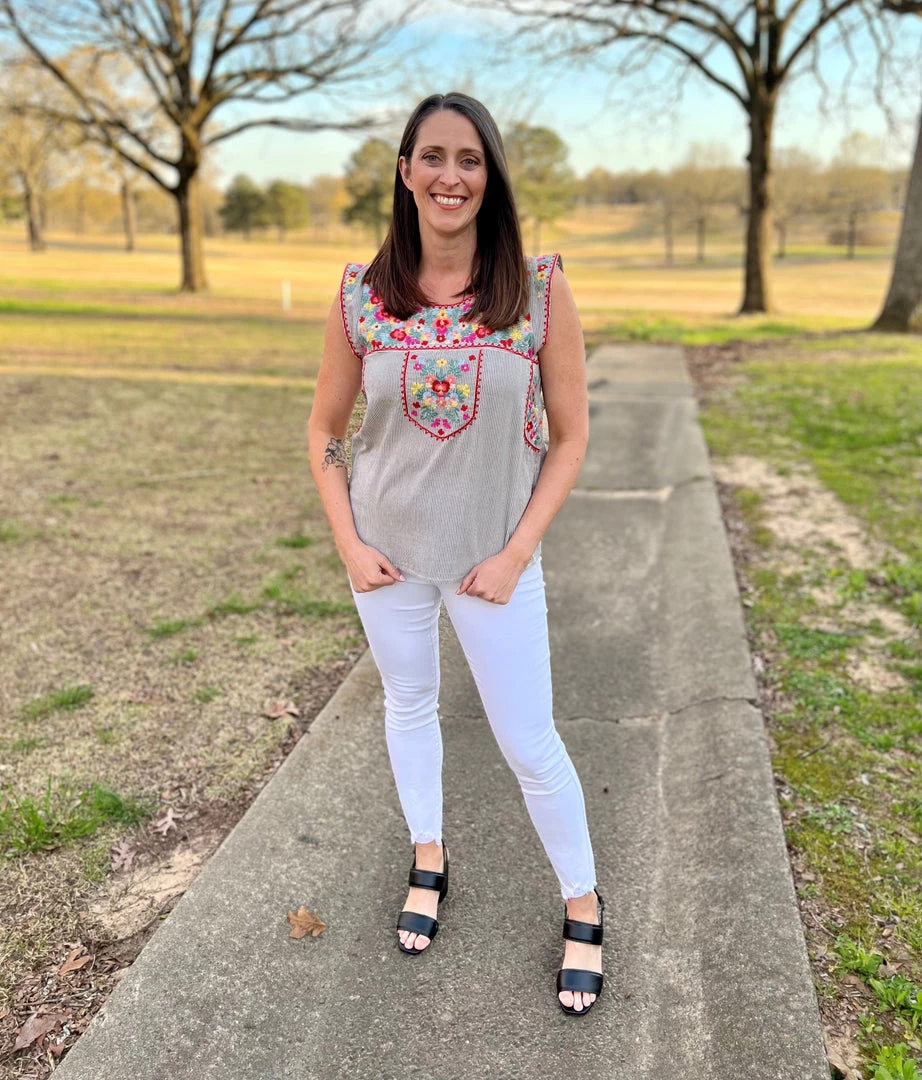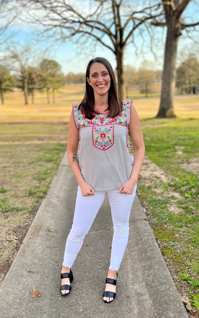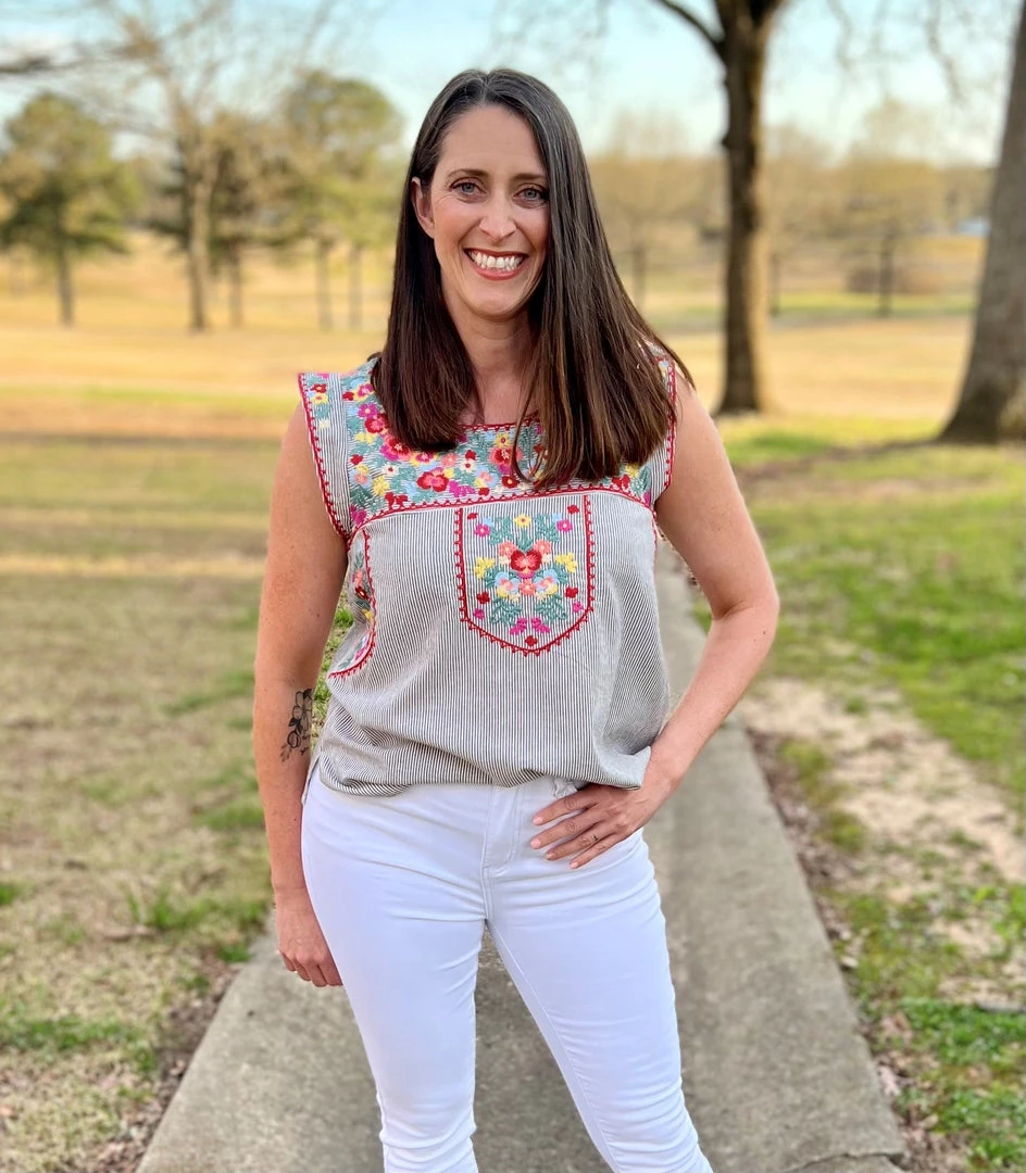 Easy striped cap sleeve top with round neckline and relaxed fit. The embroidery details are beautifully design all over front. Non sheer. 50% Rayon, 50% Cotton. Brand is Andree by Unit