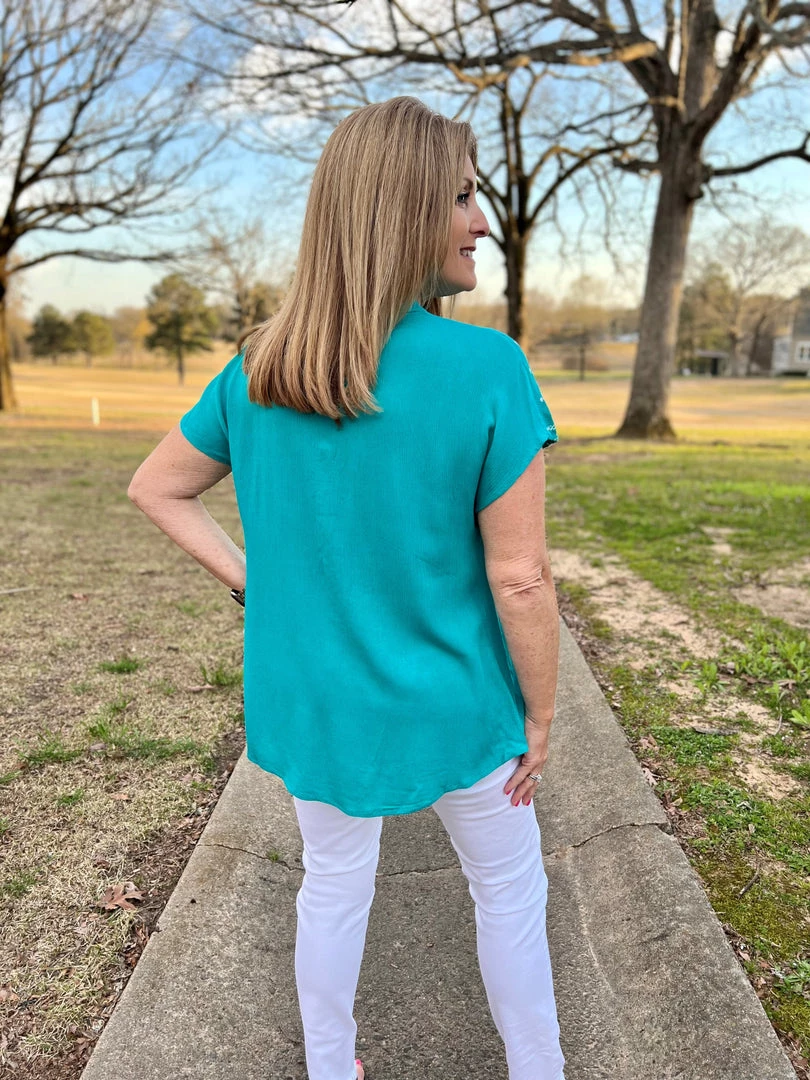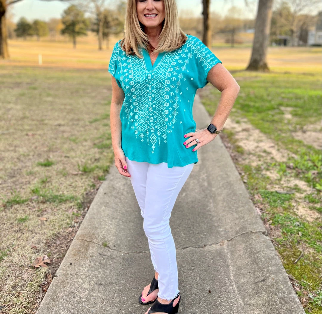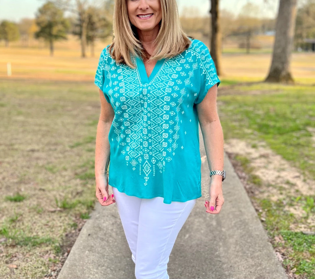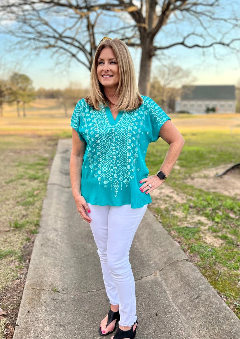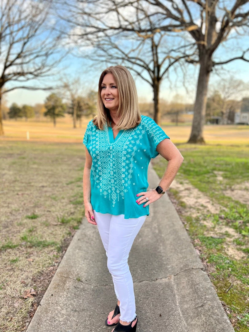 Gorgeous classic blouse with beautiful embroidery pattern throughout. This top is so charismatic with tonal embroidery throughout the top. Dolman sleeve, non sheer.