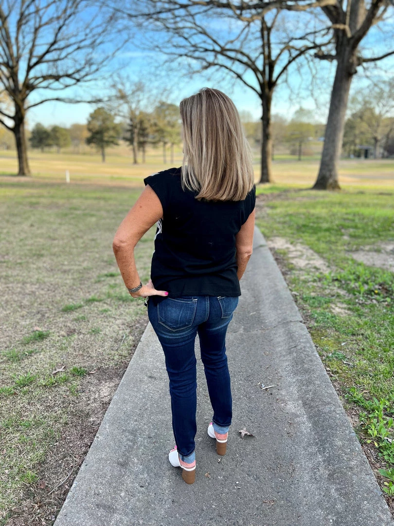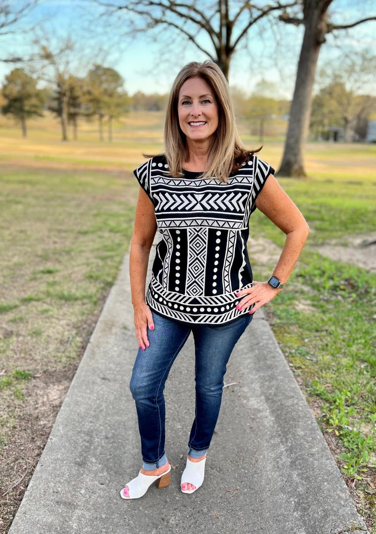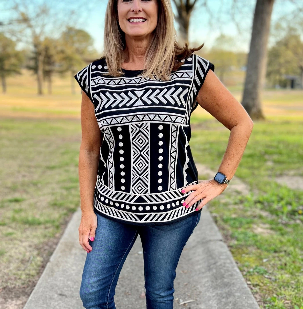 This chic knit tank top is definitely trending this season! We love the big embroidery design all over this top. Non sheer, knit. 100% Cotton. Brand is Savannah Jane.