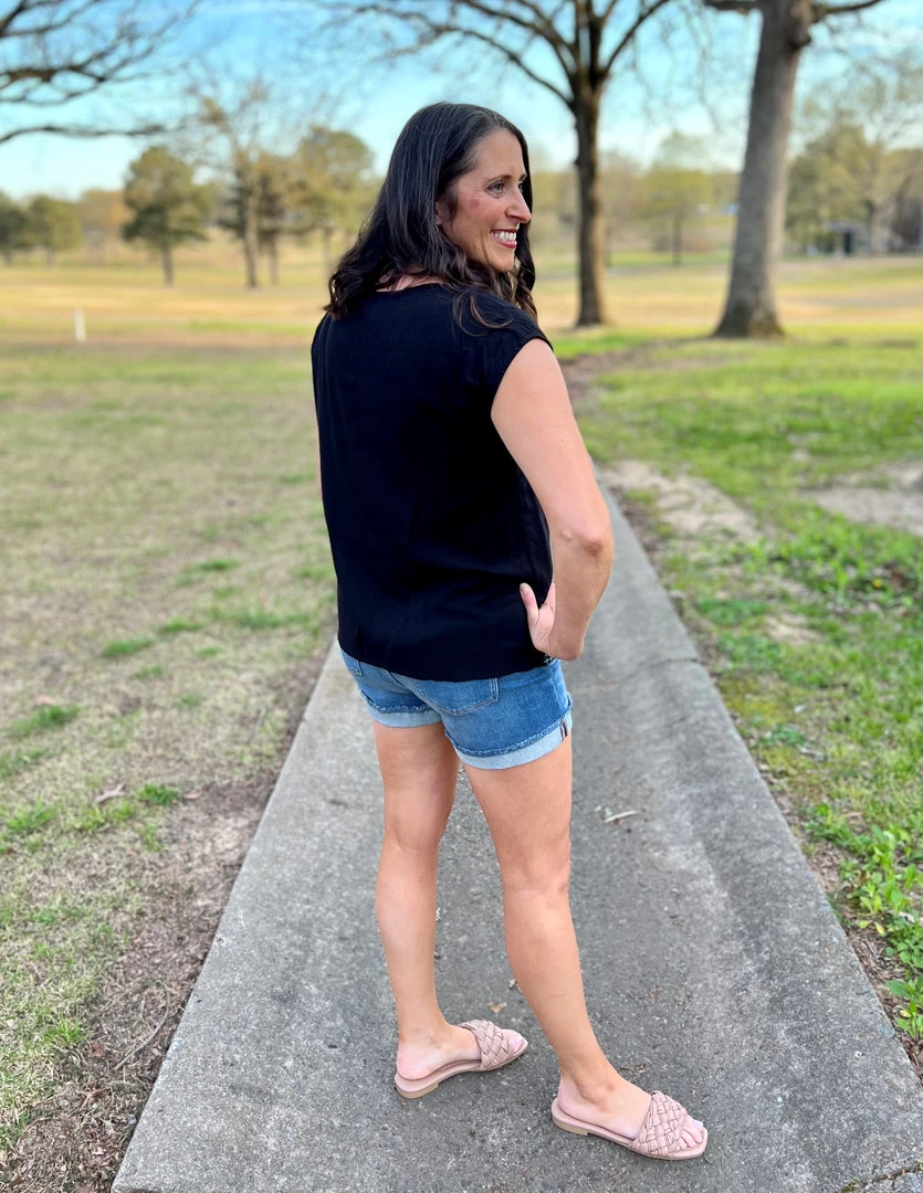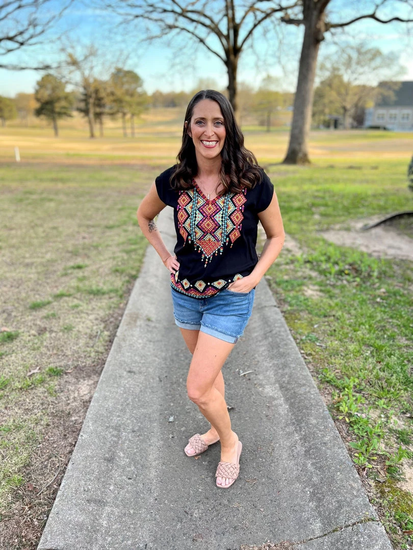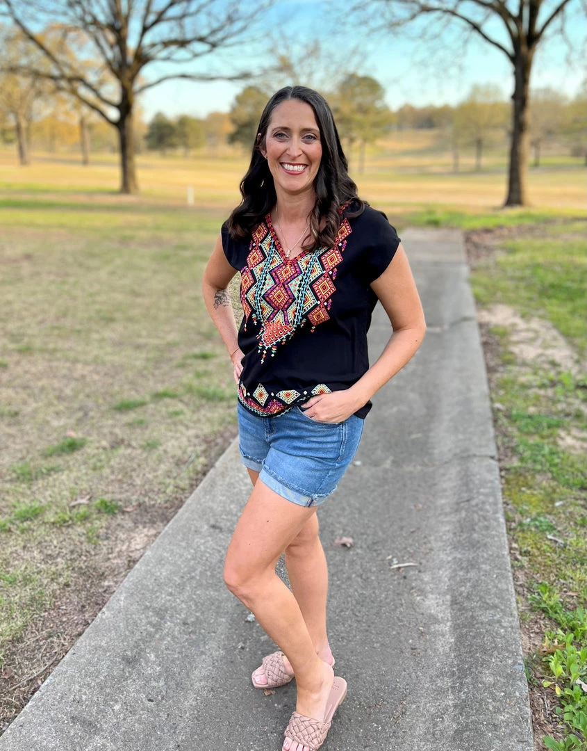 Classic embroidered top with cap sleeves and a V neckline. Bodice and neckline is embroidered with a colorful pattern.  Non sheer, woven. 100% Nylon. Brand is Savannah Jane.