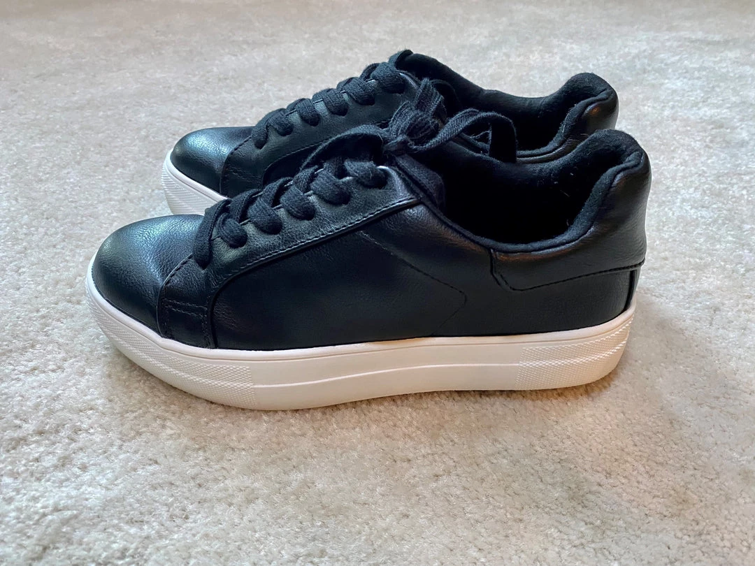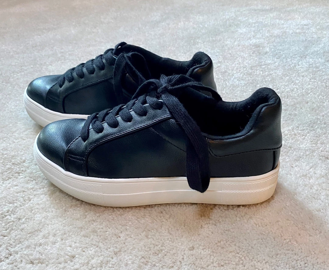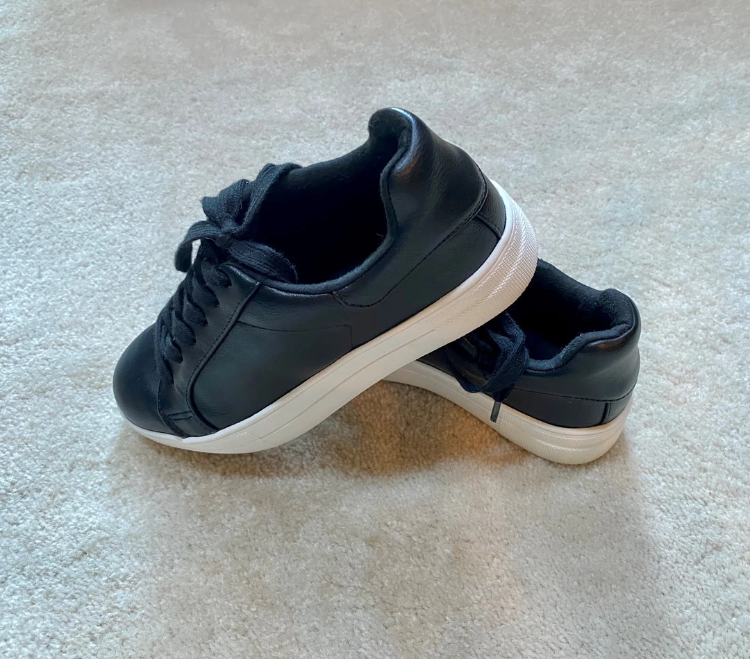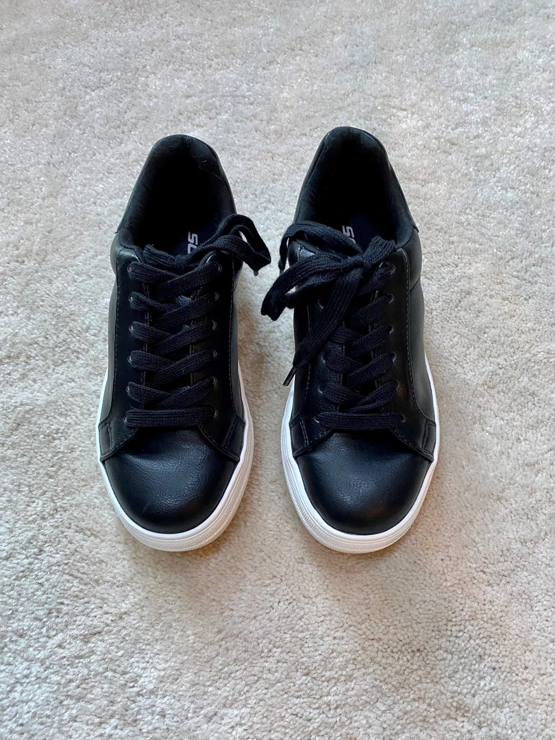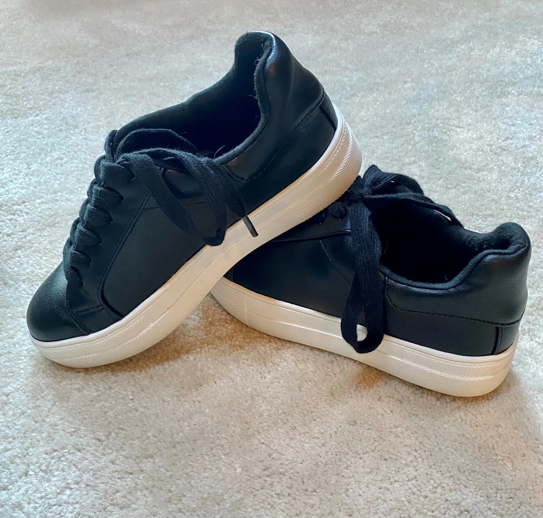 This simple black and white sneaker will be a staple for your wardrobe year around. Outer black faux leather with white laces and memory foam inside for real comfort. These can go with almost anything! Grab them fast before they are gone.