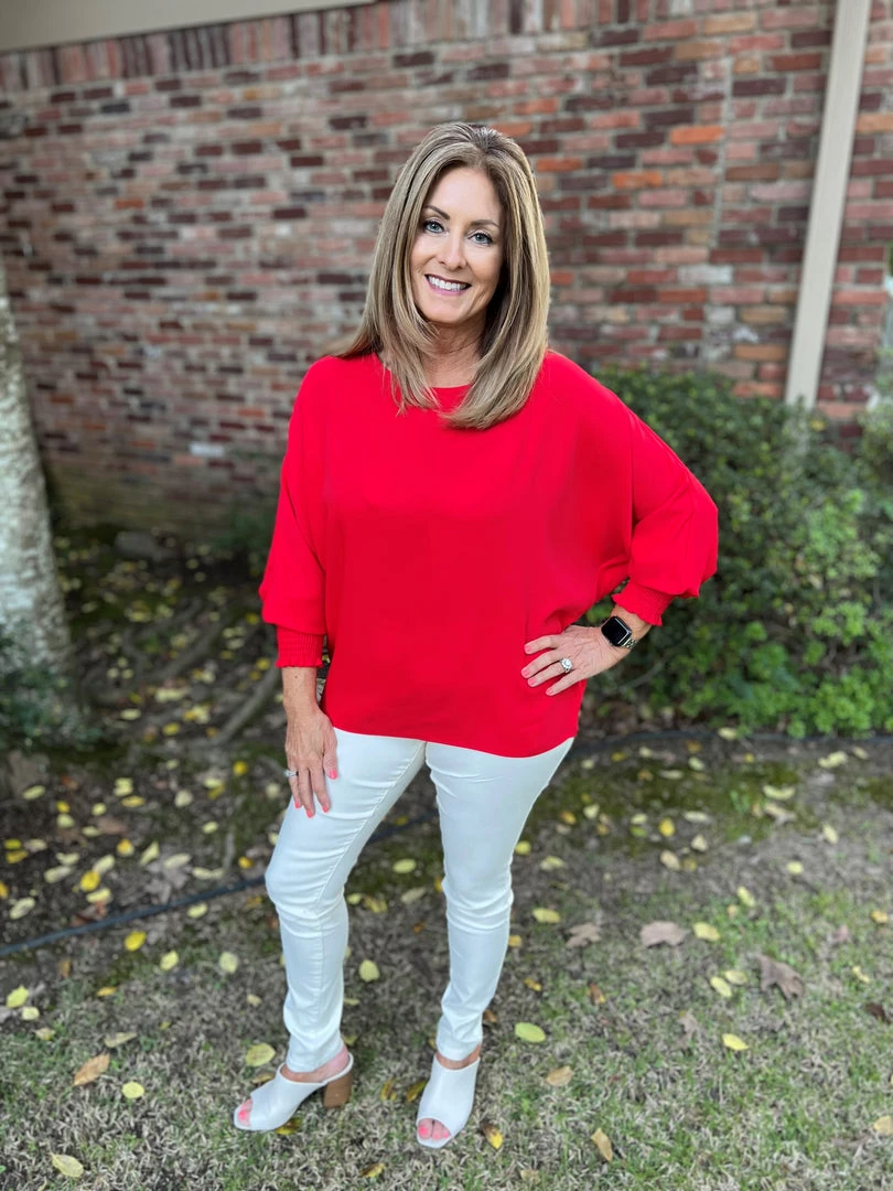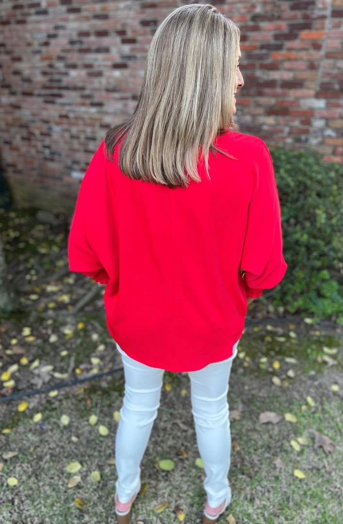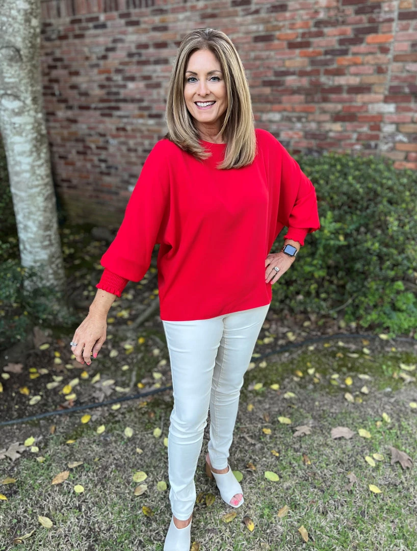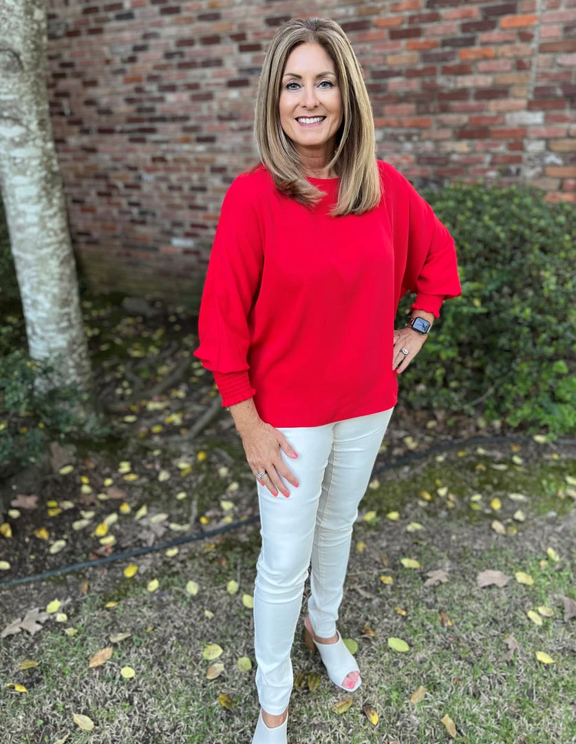 This top has this amazing smocking detail on the cuff that just sets it apart. Scoop neck and flowy 100% polyester fabric that drapes beautifully. Can easily be worn year around or under a blazer.