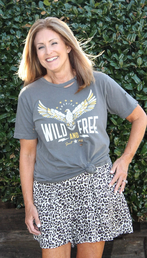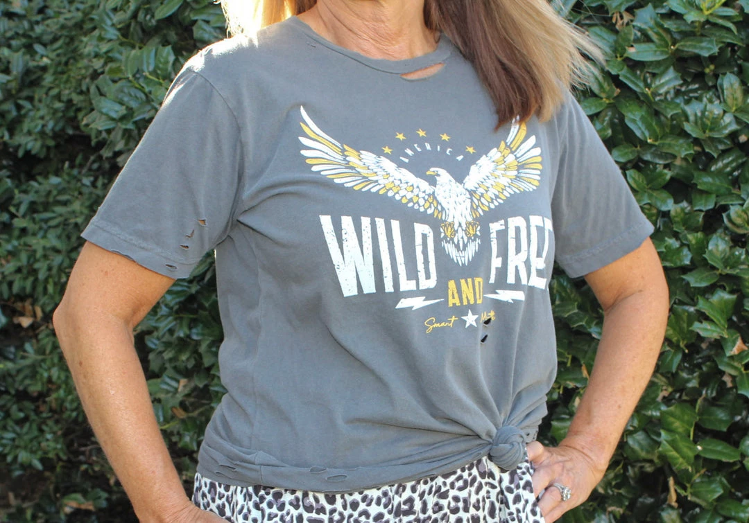 This classic eagle wild and free look is on a vintage look destroyed tee. The thin, soft t-shirt will be a staple once you try it. Made of premium quality ringspun and compacted cotton that is pigment dyed. The shirt features tears and destroyed features at the neck and on the body. Each piece is unique and very garment dye item can be a slightly different shade in color since this is a laundry dye process. Enjoy its unique quality!Â