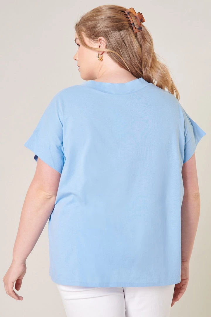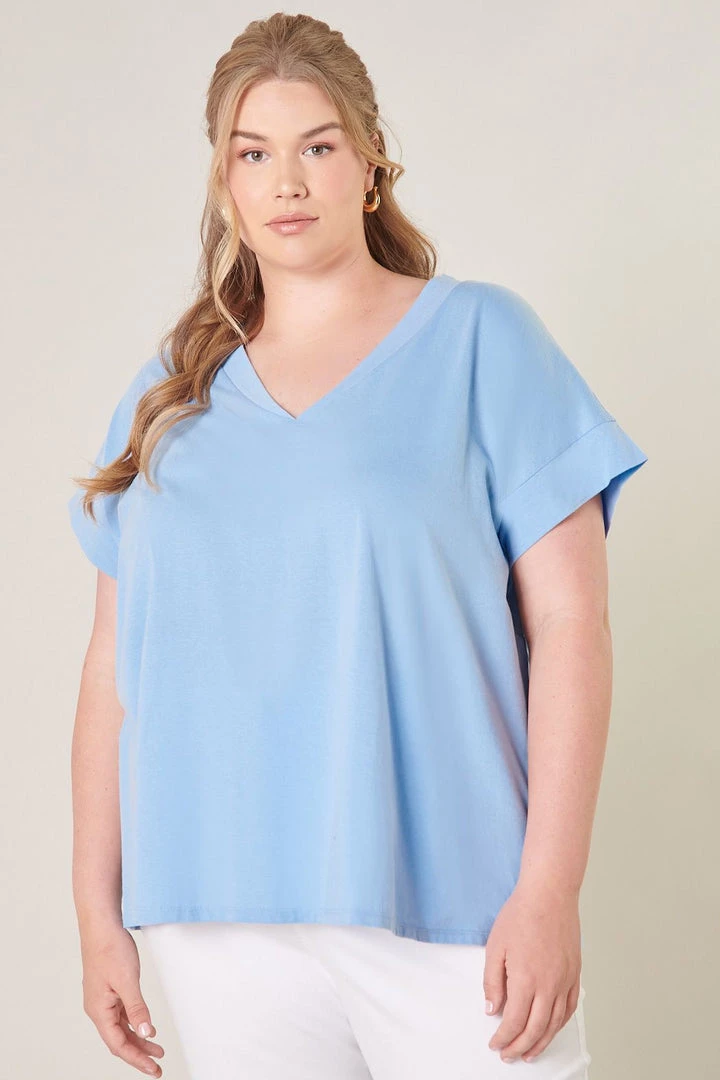 Classic T Shirt with a twist. This top has a novelty band on the v-neckline, relaxed fit, a dropped shoulder cap sleeve and is made of a soft breathable 100% cotton. Pair it with your favorite denim for an easy comfortable look! Extended sizes. Brand is Sugarlips.