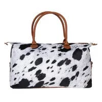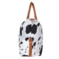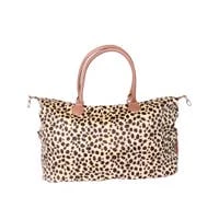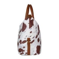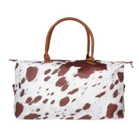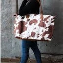 Perfect size for a weekend get away or a quick trip, these bags measure 22″W x16″H x 10″ D and have a zip top closure, inside side-zipper and hook snaps on both ends. The Straps and bottom are faux leather in cognac color and all hardware is gold in color. Can carry over the shoulder and is light-weight. Also has two pockets perfect size for cell phone and a zipper pocket on opposite side.
