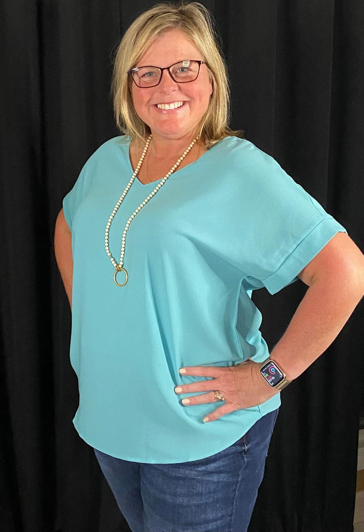 This beautiful rolled sleeve, V-neck top can be worn year around. It can easily stand alone or layer under your favorite jacket, shacket, or cardigan. Non-sheer with a relaxed fit.
