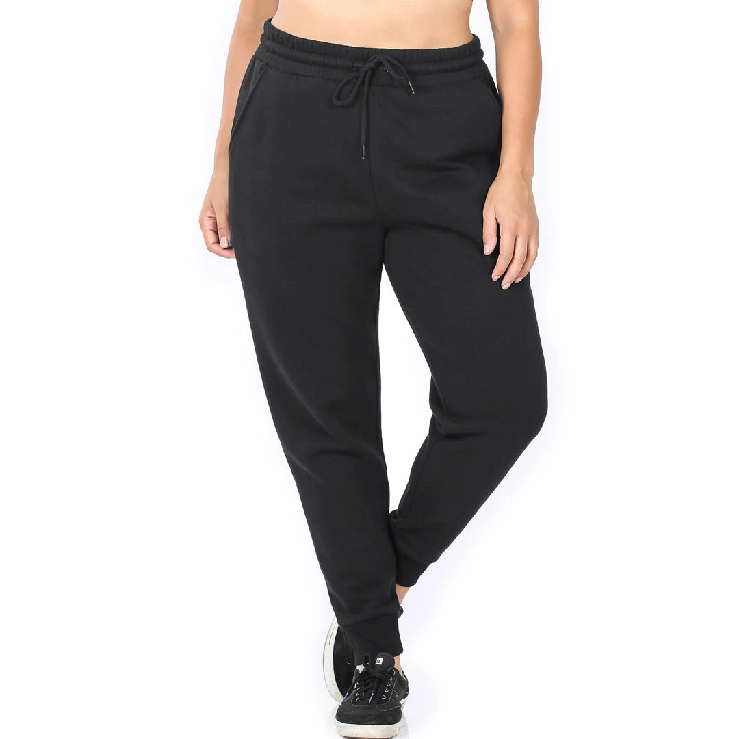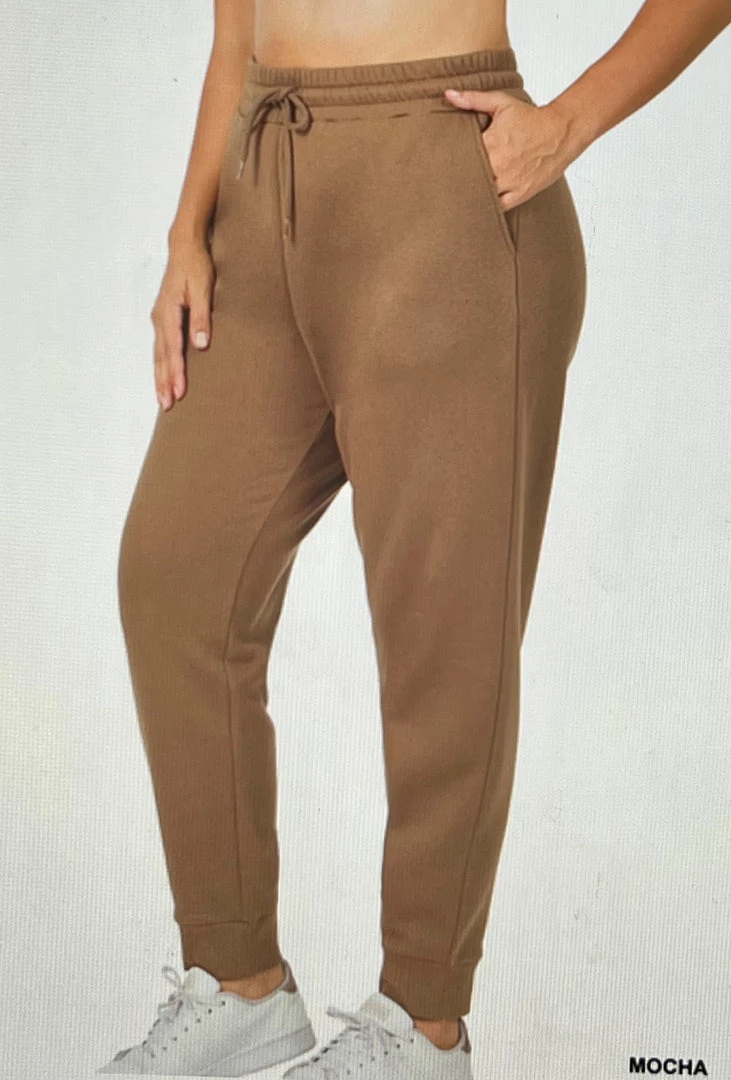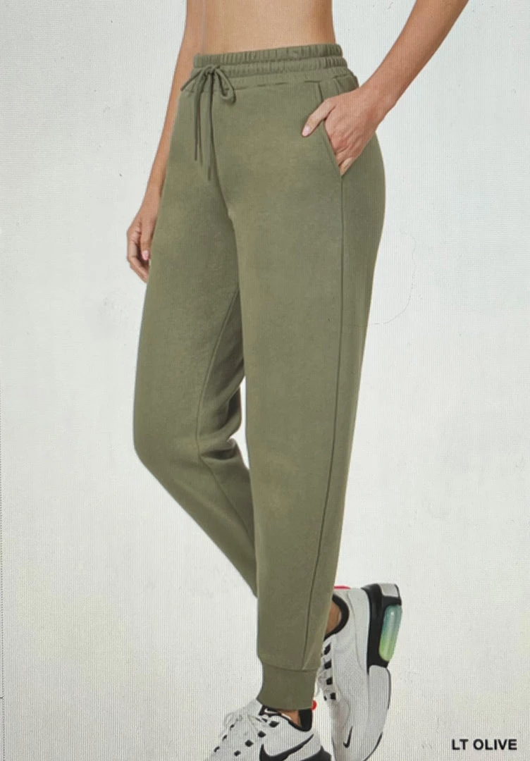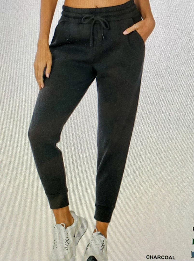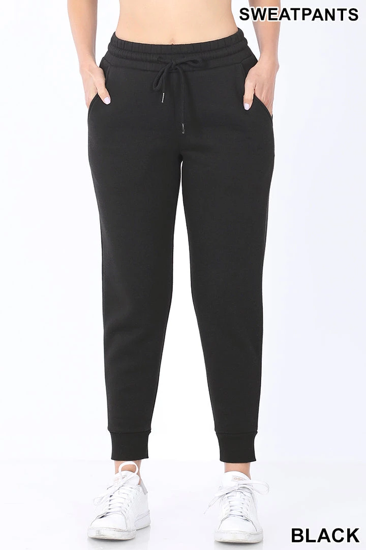 Jogger Sweatpants with elastic waistband and side pockets. Functional drawstring. Inseam on small is 27.5″.