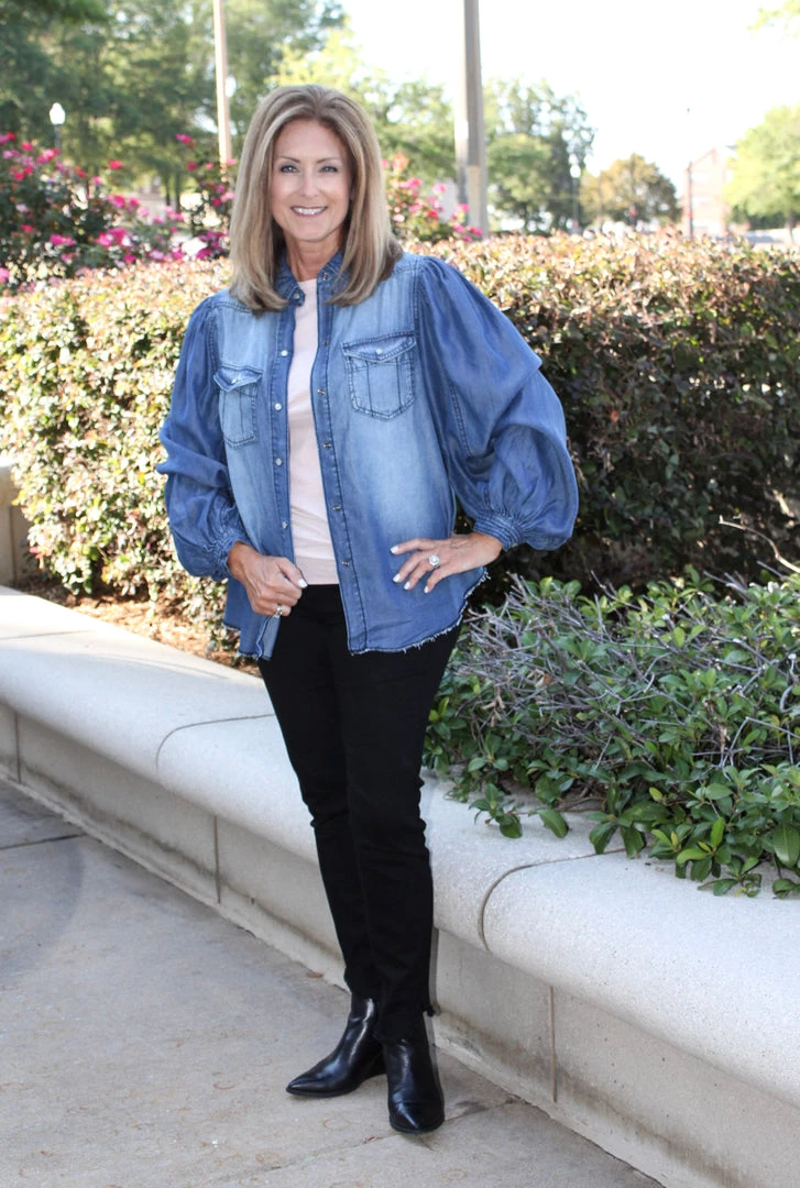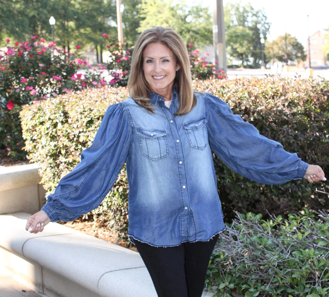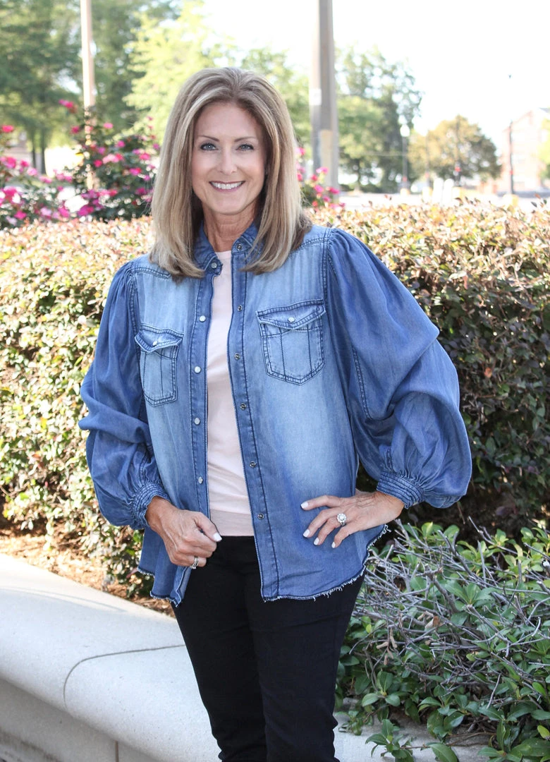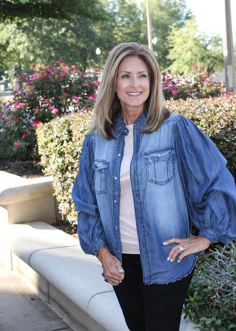 We love the unique look of the Chambray Puff Sleeve Top! Denim is everywhere is year and this look stands out on its own. Pleats at the shoulders and a front snap closure and chest snap-flap patch pockets. The color variations accent the look perfectly!
