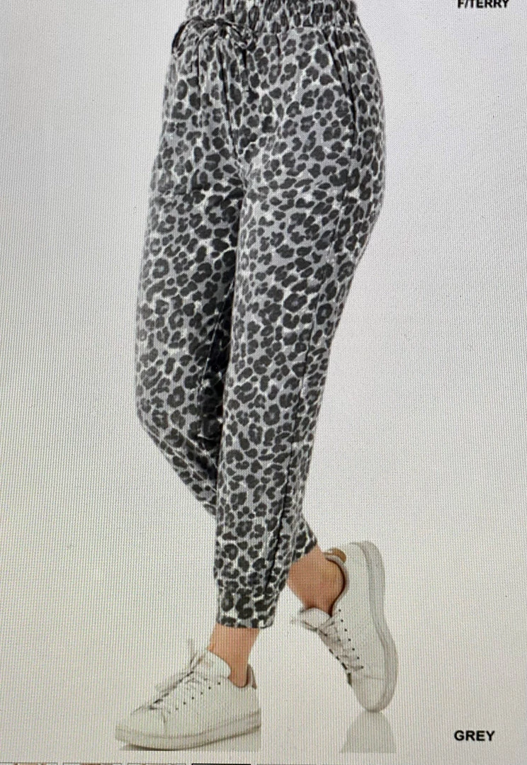 Soft French terry reverse leopard print jogger pants with pockets. Lightweight fabric with drawstring elastic waistband. 27″ inseam on small.