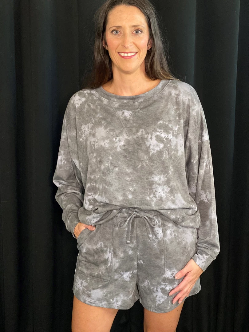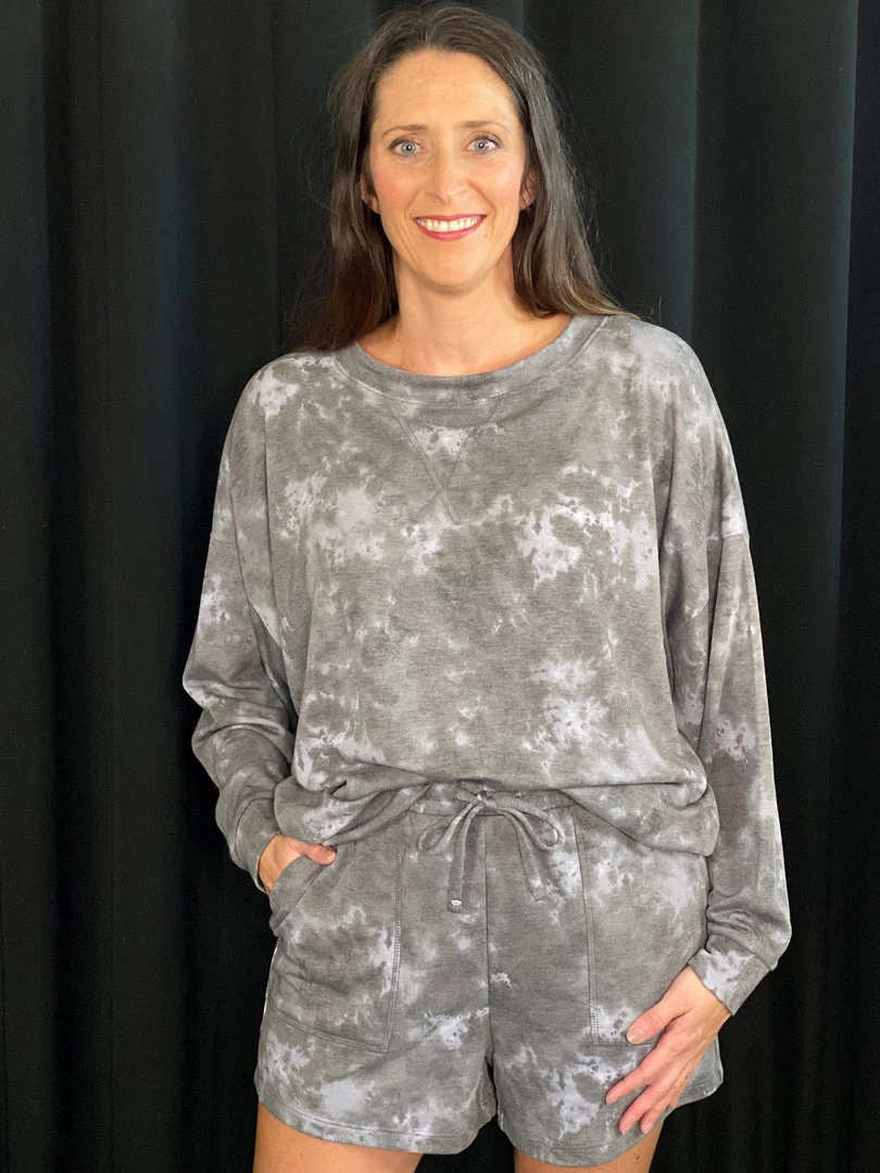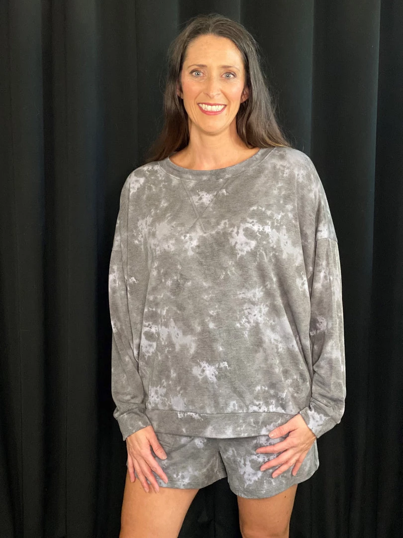 This oversized lounge set is soft and not too think. Perfect for wearing around the house, out on errands, or even to sleep in! You will not want to take this one off! The cut is oversized and roomy. Â