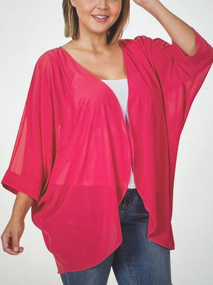 Chiffon Cardigan with shoulder pleat in a gorgeous hot pink color. Lightweight woven material flows and drapes beautifully. This will look great over anything and could be worn year around.