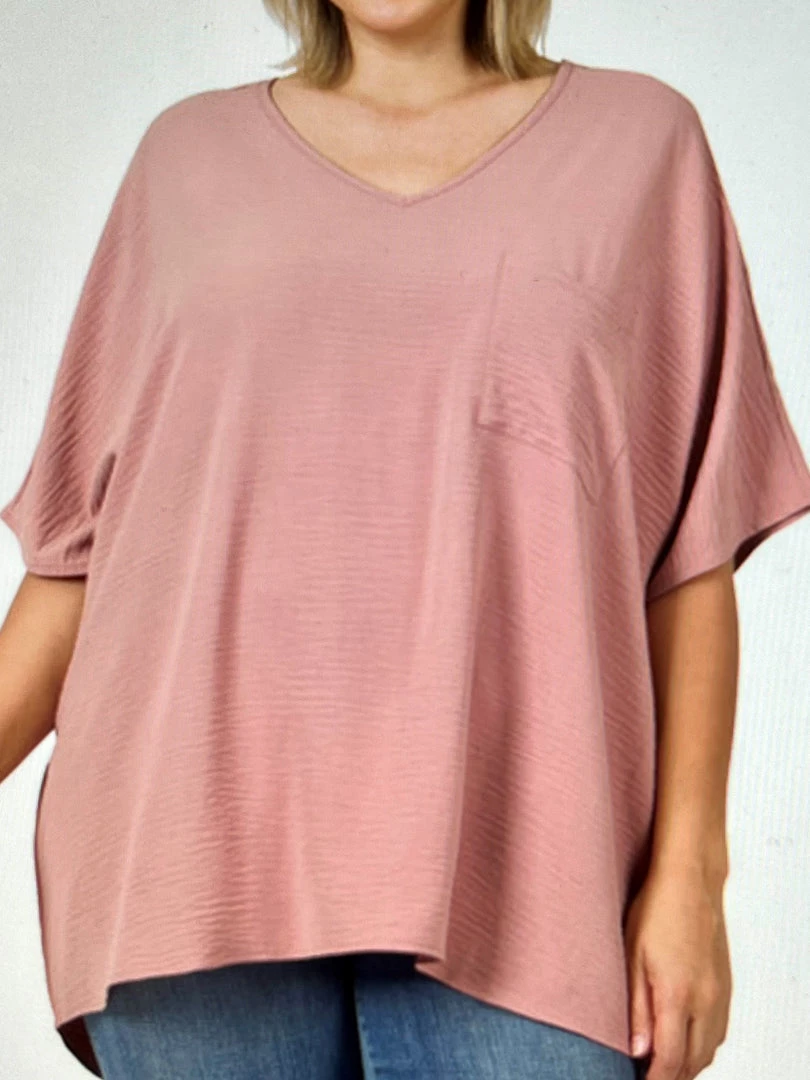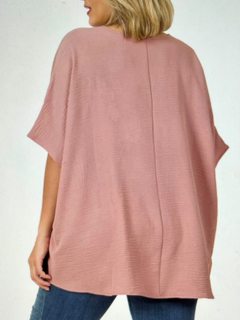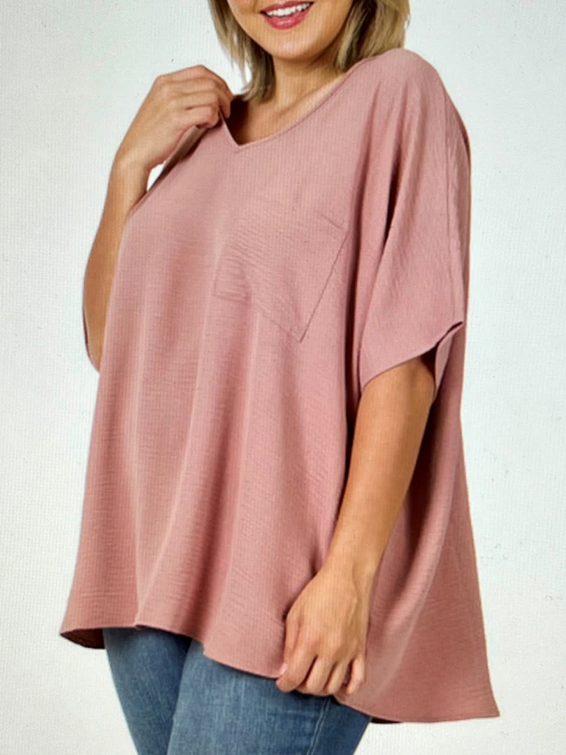 This woven air-flow textured shirt with drop shoulders and dolman sleeves in rose is a great basic piece for your wardrobe. Layer it or wear it alone for a finished look. This color is trending for spring and summer!