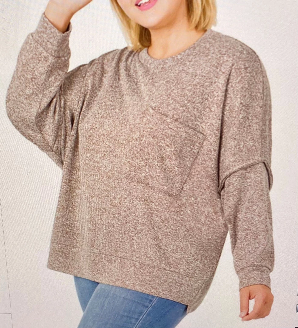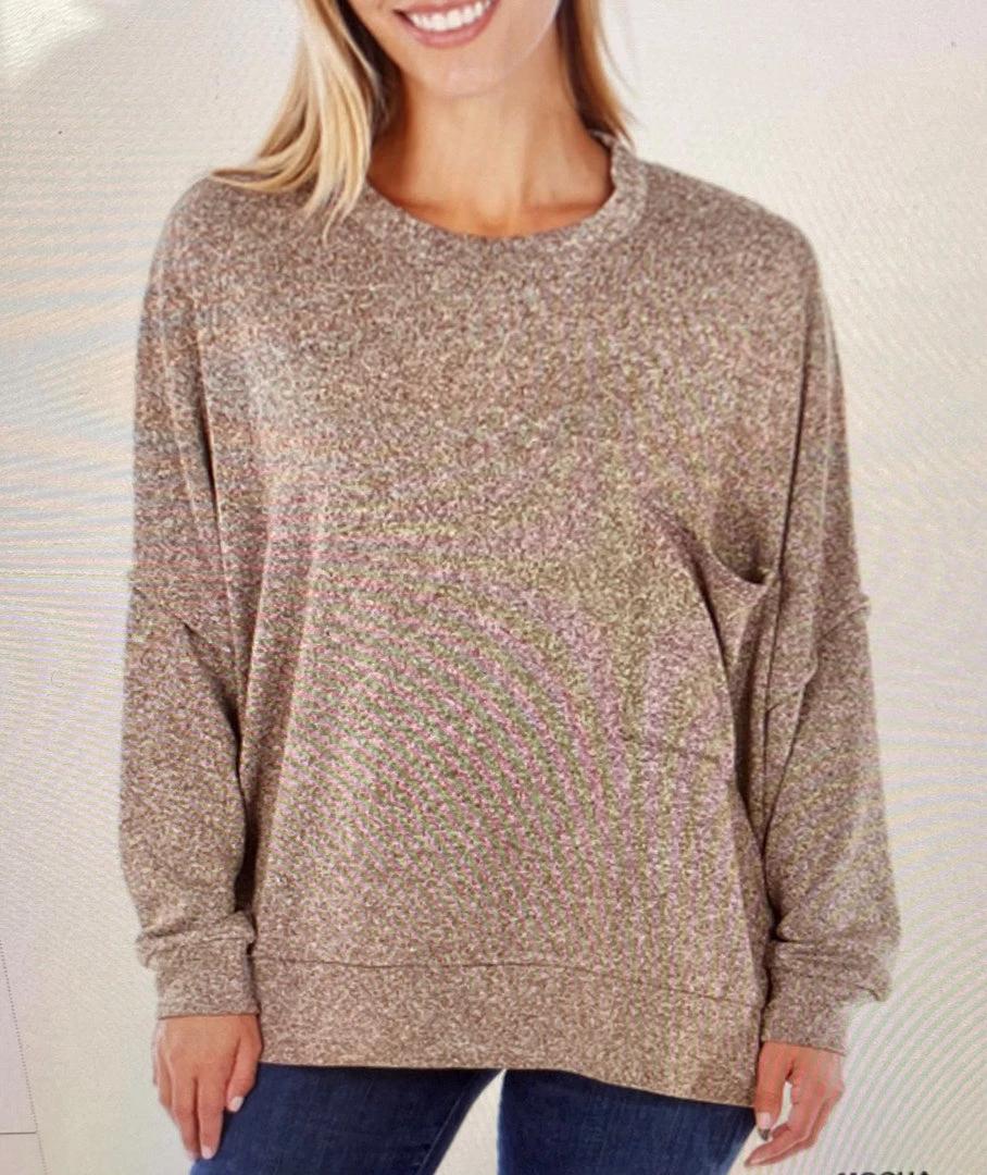 Round neck oversized, midweight sweater in mocha speckled pattern. Slightly hi-low with chest pocket. So soft and comfortable – you might not want to take it off! 100% Polyester